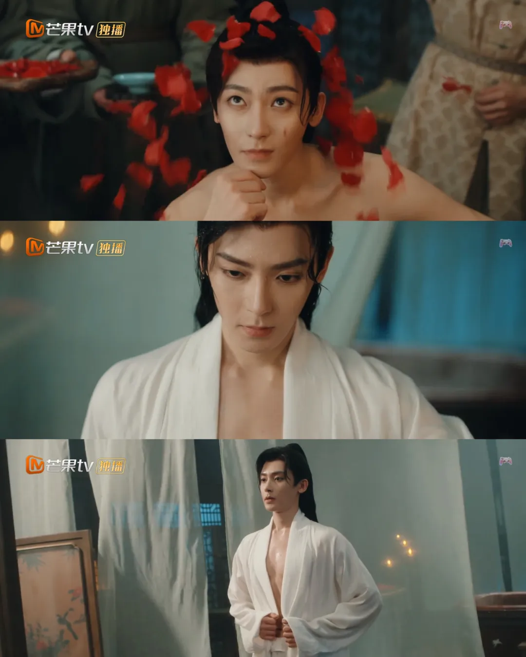 用玫瑰花瓣沐浴、湿身被送上床榻……以往在宫斗剧女主身上常见的沐浴焚香情节,被安在了男主陆江来(侯明昊 饰)的身上。