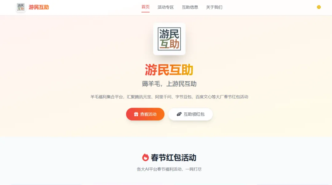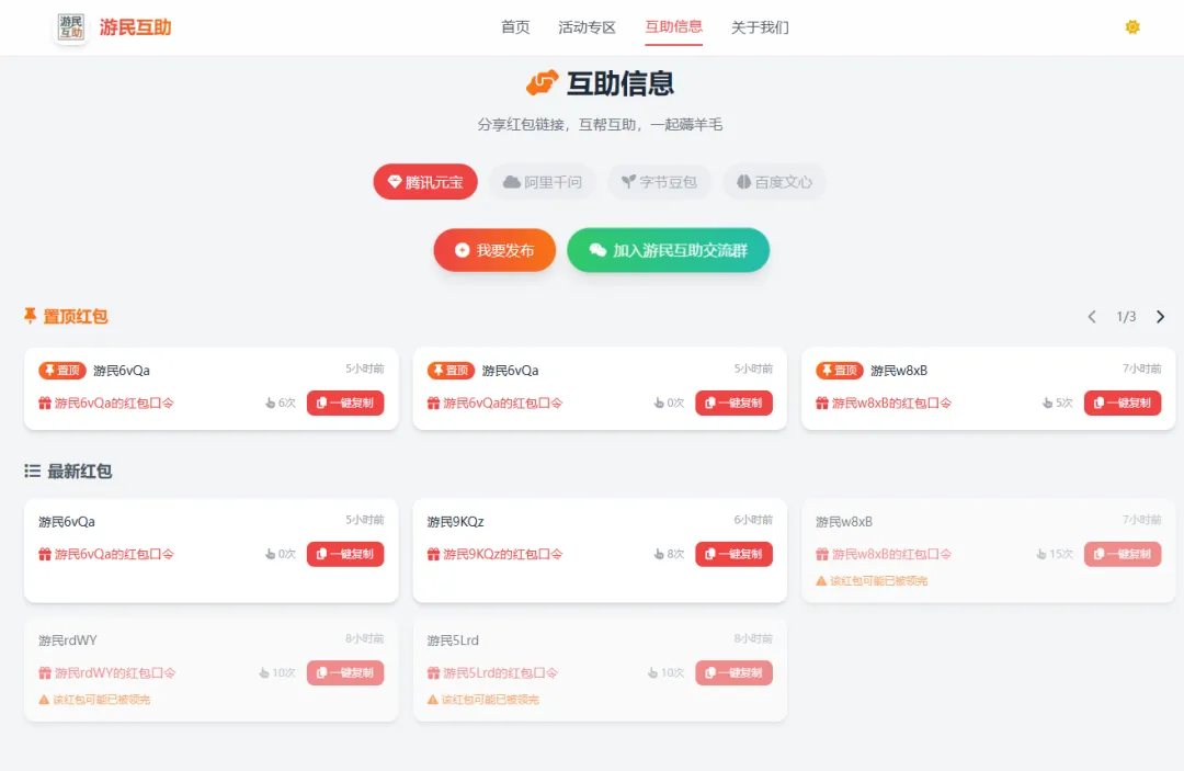 # 游民互助> 薅羊毛,上游民互助羊毛福利集合平台,汇聚腾讯元宝、阿里千问、字节豆包、百度文心等大厂春节红包活动。## 项目概述游民互助是一个红包互助平台,用户可以分享自己的红包口令,其他用户复制口令后可以在对应App中领取红包,实现互帮互助。**官网**:https://yangmao.geo1688.cn## 技术栈| 层级 | 技术 ||------|------|| 前端 | HTML5 + TailwindCSS + 原生JavaScript || 后端 | Node.js + Express || 数据库 | SQLite (better-sqlite3) || 进程管理 | PM2 || Web服务器 | Nginx (宝塔面板) |## 功能特性### 前台功能-🏠 首页导航(活动专区、互助信息、关于我们)-🎁 春节红包活动展示(支持多平台轮播)-🤝 红包口令发布与浏览(仅展示当天口令)-📌 置顶功能(需要置顶口令)-� 一键复制口令(iOS/Android全兼容)-📊 领取次数统计-🌓 日间/夜间模式切换-� 响应式设概计(PC/移动端适配)-� 移动端轮(播图(支持左右滑动和按钮切换)### 后台功能-� 数据统计概览-🎯 活动管理(增删改查)-⚙️ 平台配置(启用/禁用、口令校验规则)-📝 互助信息管理(置顶/删除,可查看历史数据)-🔧 系统设置(分页数量、领取上限)-🔑 置顶口令管理-🛡️ 敏感词管理(过滤违法、色情等不良信息)### 安全功能-✅ 请求频率限制(每分钟60次)-✅ 发布次数限制(每用户每天3次)-✅ 口令格式校验(正则表达式)-✅ 敏感词过滤(可后台配置)-✅ 自动数据备份(每6小时)-✅ 环境变量配置(敏感信息不硬编码)-✅ 内存缓存(减少数据库压力)---## 口令格式说明腾讯元宝口令格式:`营销文案 + 识别码 + 前缀:/字符串(10位)`示例:春节到,复制口令打开元宝App,红包抢起来! CZ9988 At:/E7ORFTQW1W默认校验规则(正则表达式):.+:/[A-Za-z0-9]{10}$可在后台「平台配置」中修改校验规则。---## 数据有效期-**口令有效期**:当天(0点-24点)-**前台展示**:仅显示当天发布的口令-**后台管理**:可查看所有历史数据---## 数据备份系统已内置自动备份功能:-默认每6小时自动备份一次-备份文件保存在`server/backups/`目录-默认保留7天的备份,过期自动清理## 性能优化### 已实现的优化1.**内存缓存**-缓存活动配置(5分钟TTL)-缓存平台配置(5分钟TTL)-缓存系统设置(5分钟TTL)-配置变更时自动清除缓存2.**数据库索引**-platform索引-pinned索引- created_at索引---## 联系方式-**官网**:https://yangmao.geo1688.cn-**邮箱**:xuys997@gmail.com-**公众号**:数字游民9527---## 版权信息© 2025-2026 游民互助 All Rights Reserved.