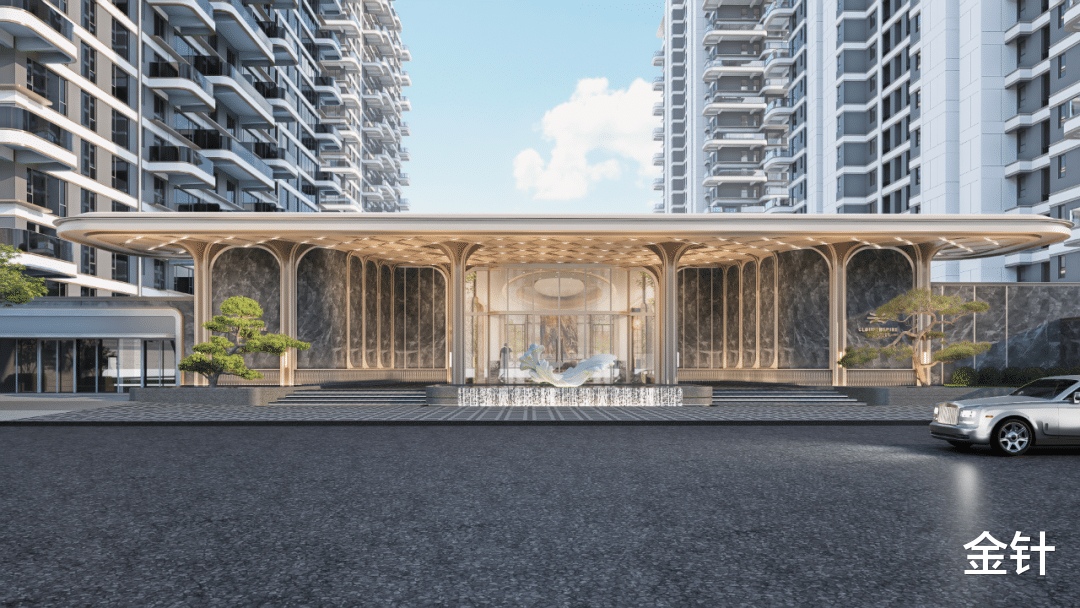 约48米超宽封面级门头,轩昂舒展,质感纯粹,搭配油松迎宾,蓝钻水景,大宅气度不彰自显。