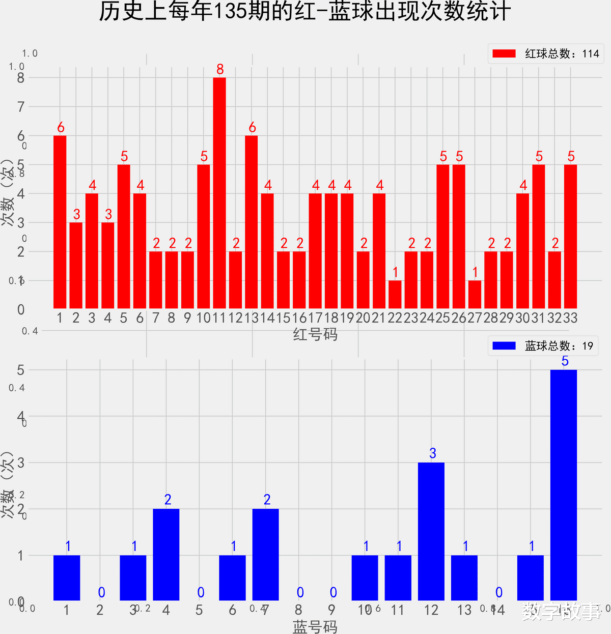统计每年135期的样本数据:114个红球 19个蓝球