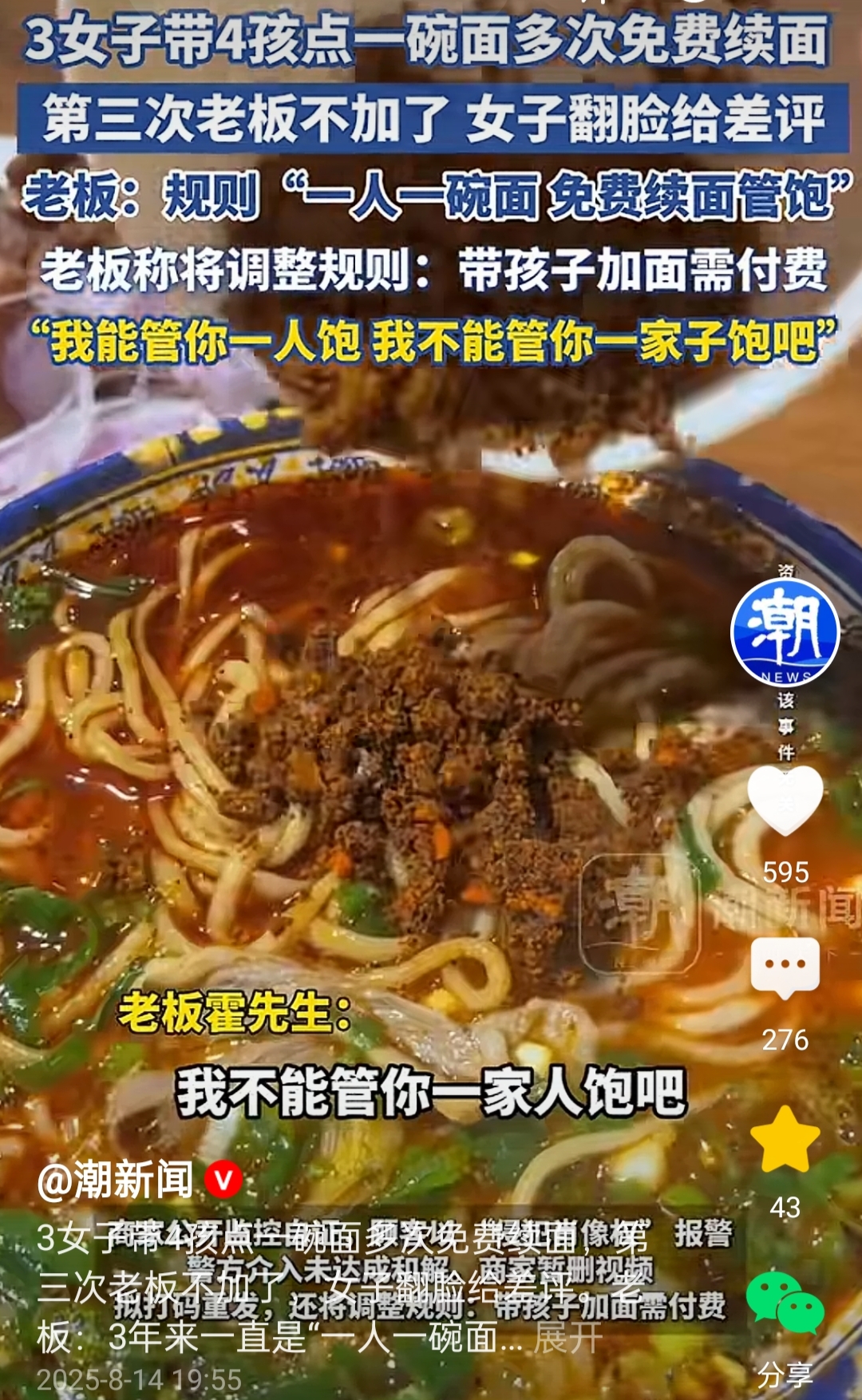 在社交媒体上,一名面馆老板发的视频火了,根据老板的说法,3个女子带4个孩子只点了一碗面,前面两次加面,都给他们加了,第三次加面时,老板拒绝了。