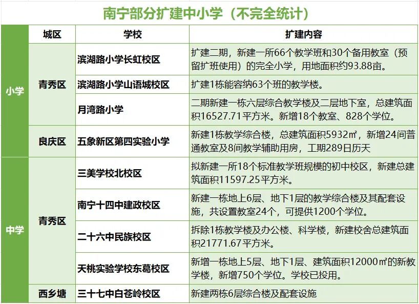还有一点得留个心眼,你看上的学校有没有变化?我整理了一个表格,南宁好几所学校都在改扩建。有扩建的,学位相对稳当;没扩建的,保不齐有分流的危险。