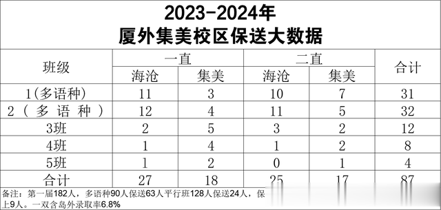 小升初说白了就是择优,能考进去基本高中保送外国的高中部希望非常非常大,也就是你的孩子将来考一个什么重点大学,的难度就很小了。基本接近100%保送高中部外国语海沧或是集美高中部!