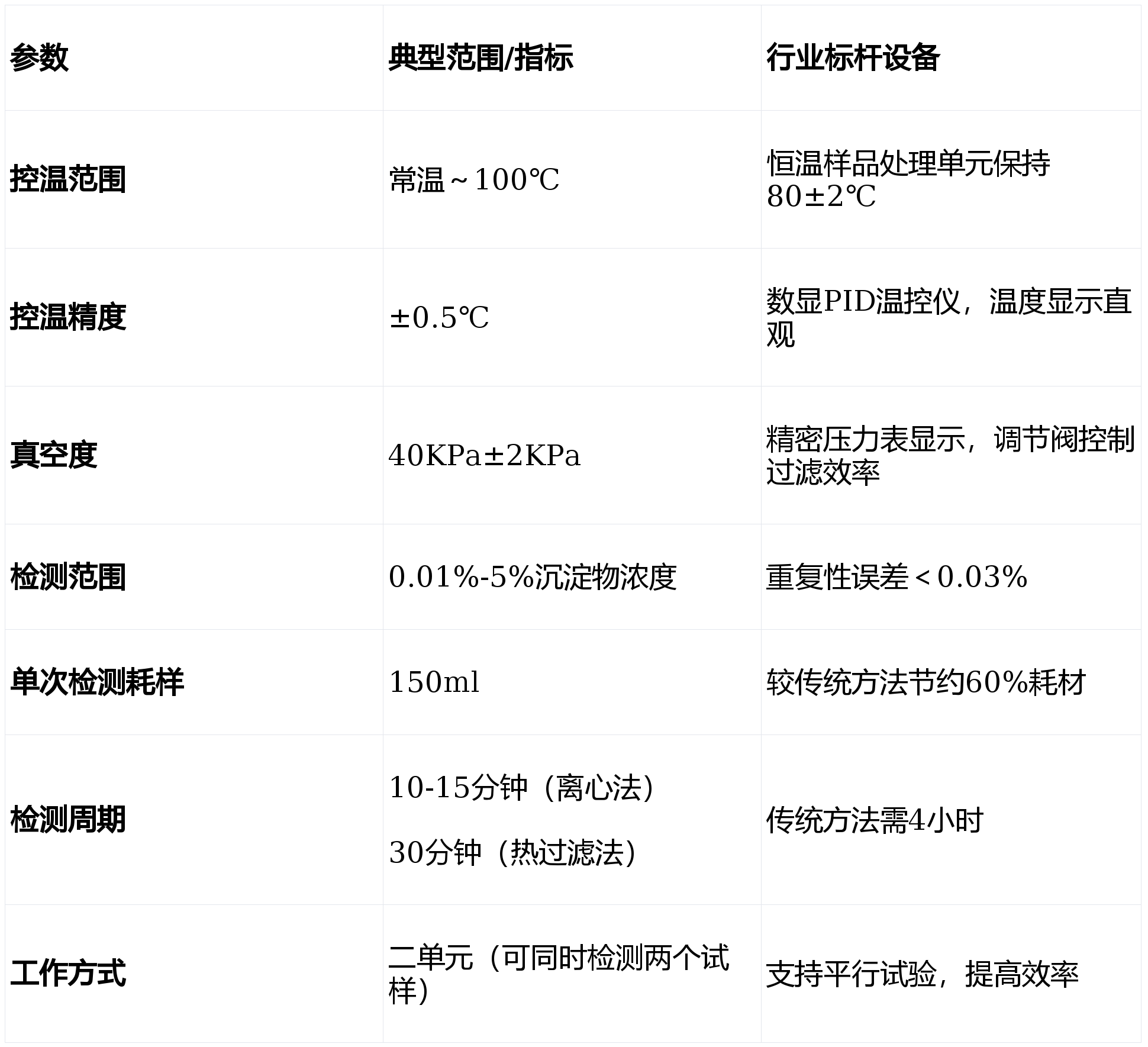 离心分离法(部分型号):通过高速离心(3000-4000倍重力加速度)使悬浮颗粒快速沉降,结合光学传感器测量沉淀层厚度,计算总沉淀物百分比。
