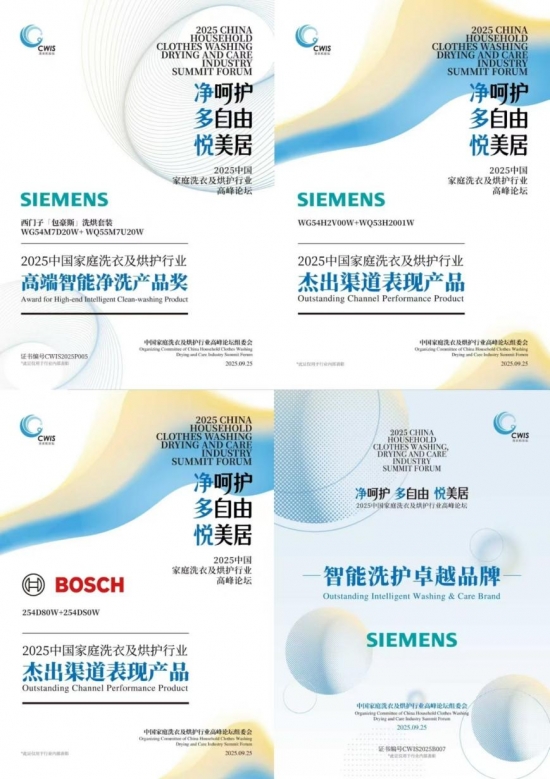 9月25日,由中国家电网主办的“净·呵护 多·自由 悦·美居 2025中国家庭洗衣及烘护行业高峰论坛”在山东济南召开。会上,西门子「包豪斯」洗烘套装、西门子小晶钻奢护大师6系活氧WG54H2V00W+WQ53H2001W洗烘套组分别斩获“2025中国家庭洗衣及烘护行业高端智能净洗产品奖”和“2025中国家庭洗衣及烘护行业接触渠道表现产品”。博世WM254D80W+WD254DS0W洗烘套组获得了“2025中国家庭洗衣及烘护行业杰出渠道表现产品”。与此同时,西门子家电还获得了“2025中国家庭洗衣及烘护行业智能洗护卓越品牌”品牌大奖。满载的荣誉,不仅是行业对博西家电品牌和产品的认可,更彰显了其产品的创新力!