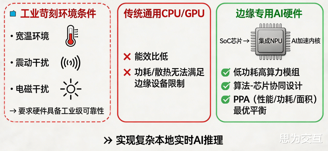 工业环境苛刻(如宽温、震动、电磁干扰),要求计算硬件必须具备工业级可靠性。传统的通用CPU/GPU能效比低,难以满足边缘设备对功耗和散热的严苛限制。因此,集成专用神经网络处理器(NPU)、AI加速内核的SoC芯片,以及面向边缘优化的低功耗、高算力模组,成为硬件基础。这些硬件通过算法-芯片协同设计,在性能、功耗和面积(PPA)上实现最优平衡,为复杂的本地实时推理提供可能。