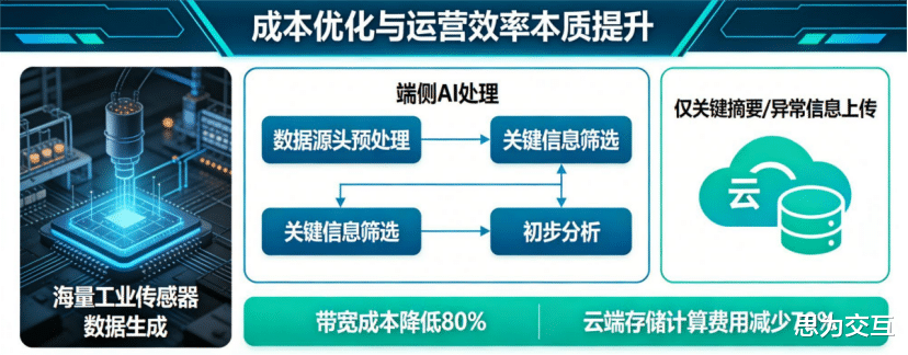 海量工业传感器持续产生数据,若全部上传云端,将产生惊人的带宽成本和云端存储计算费用。端侧AI通过在数据源头进行预处理、筛选和初步分析,只将关键摘要或异常信息上传,极大减轻了网络带宽压力和云端资源消耗,实现了综合成本的显著降低。同时,本地化处理降低了对持续稳定高速网络的依赖,使在偏远矿区、海上平台等网络条件不佳的工业场景部署智能化应用成为可能。