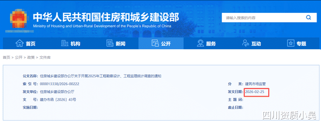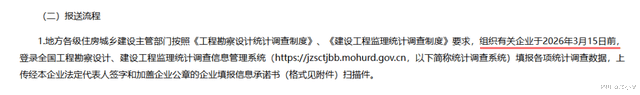 2026年2月27日,住建部正式印发《关于开展2025年工程勘察设计、工程监理统计调查的通知》。根据通知要求,相关企业需于2026年3月15日前完成年度数据填报。