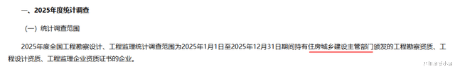 2025年度全国工程勘察设计、工程监理统计调查范围为2025年1月1日至2025年12月31日期间持有住房城乡建设主管部门颁发的工程勘察资质、工程设计资质、工程监理企业资质证书的企业。