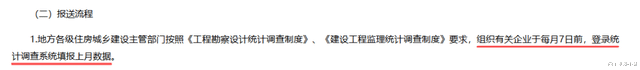 1.地方各级住房城乡建设主管部门按照《工程勘察设计统计调查制度》、《建设工程监理统计调查制度》要求,组织有关企业于每月7日前,登录统计调查系统填报上月数据。