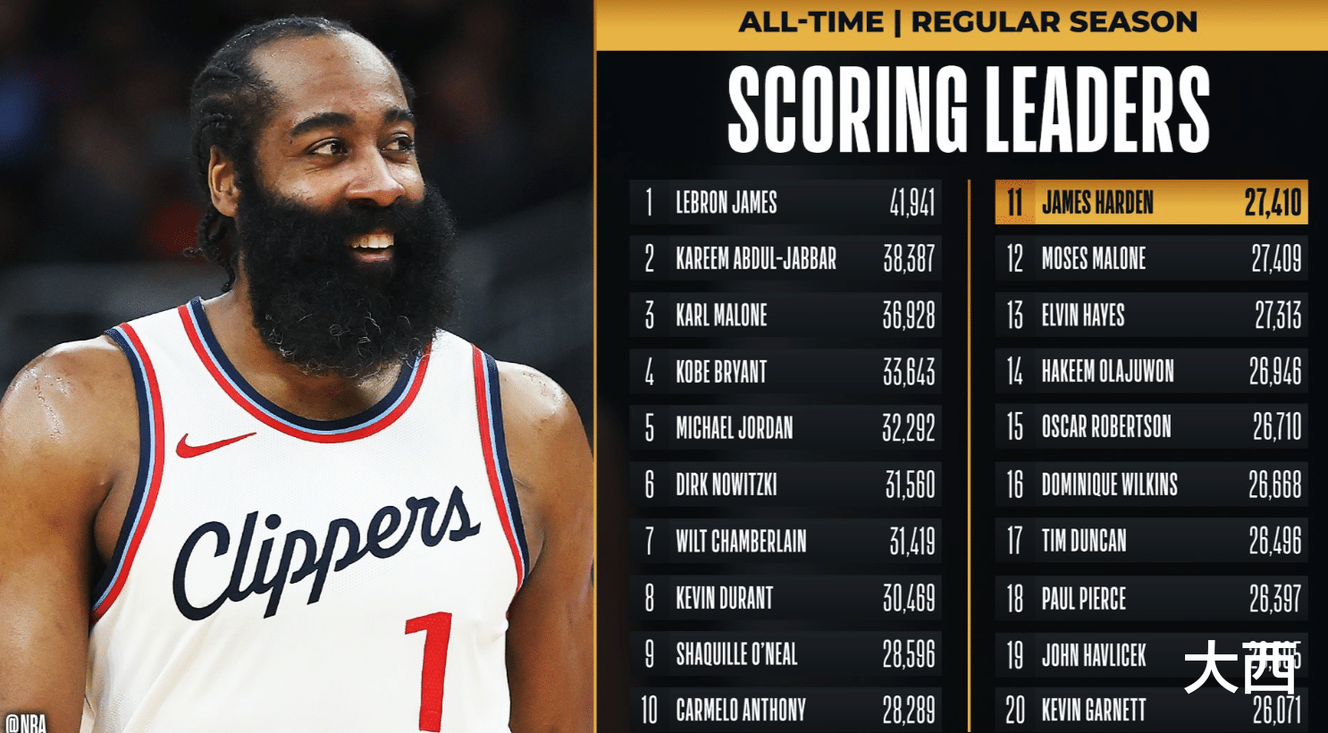 马龙是NBA的传奇球星,他当年在联盟打了21年的时间,生涯场均可以砍下20.3分12.3篮板的华丽数据,也实现了荣誉的大满贯,最终累计了27409的总得分,表现无可挑剔。作为晚辈,哈登也是超级得分手,他是2009年的选秀,进入联盟仅仅是16年的时间,他生涯场均可以拿下24分5篮板7助攻的华丽数据。同样的得分纪录,哈登少用了5年时间,太过强大了,而他下一步就是冲击历史前十了。
