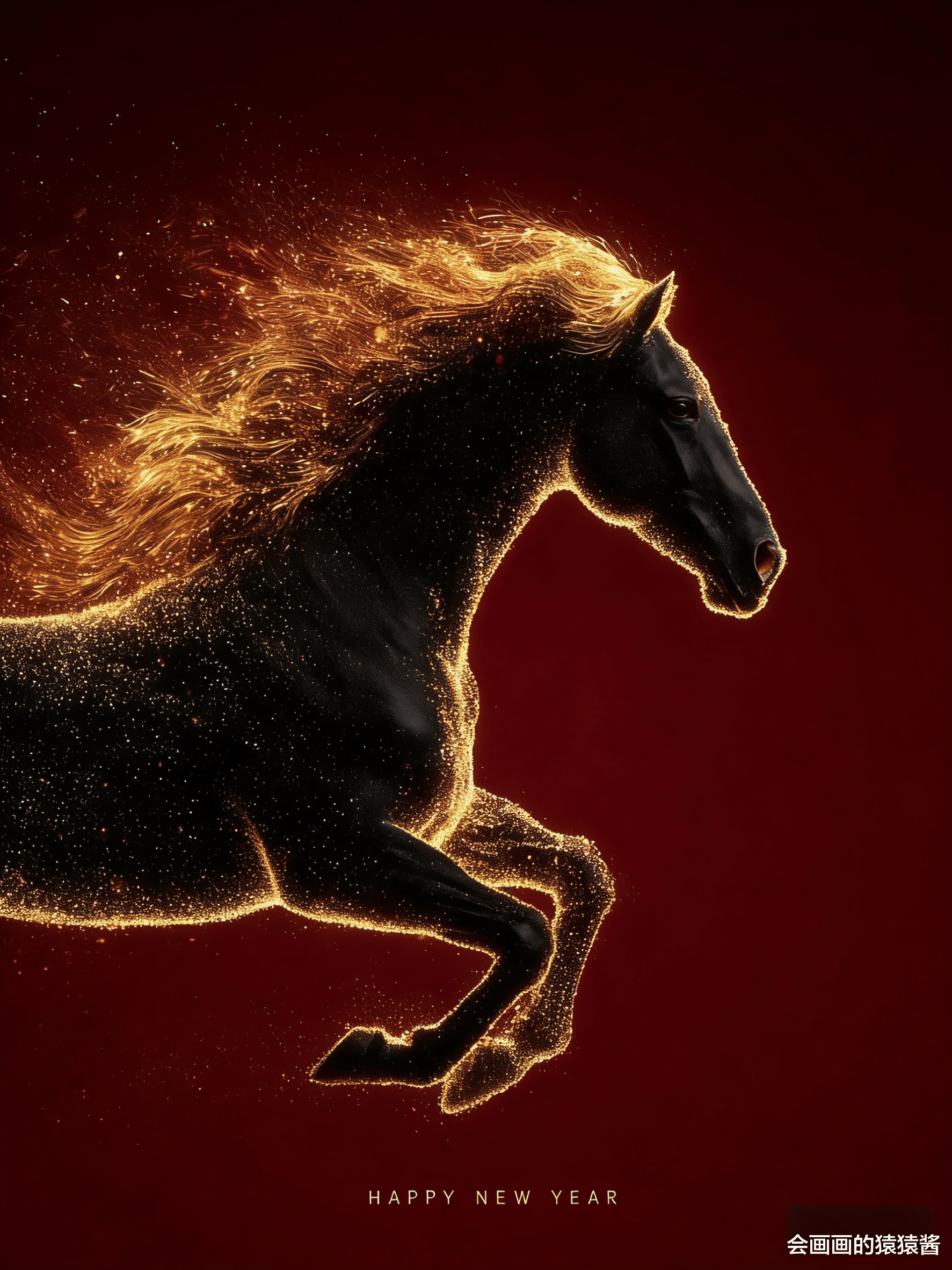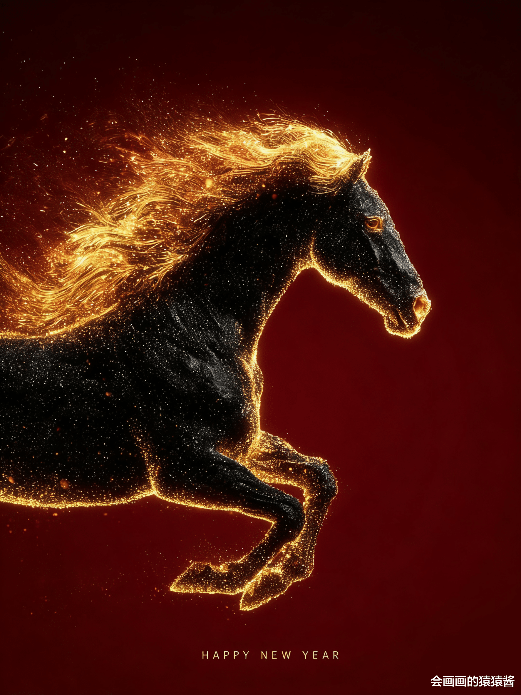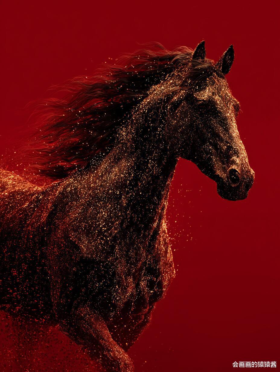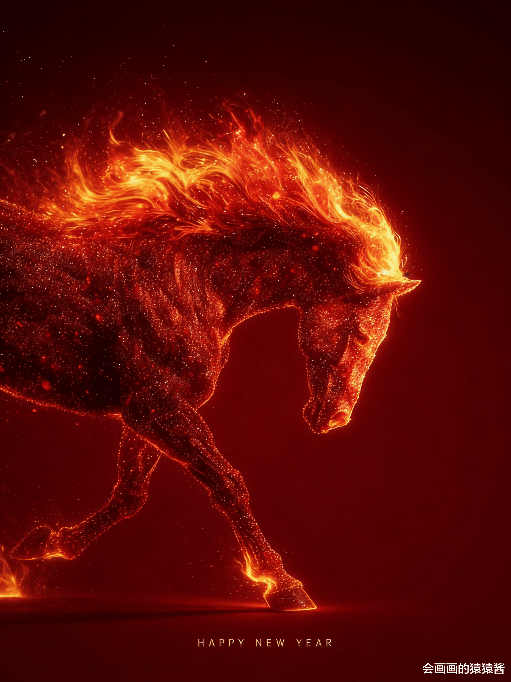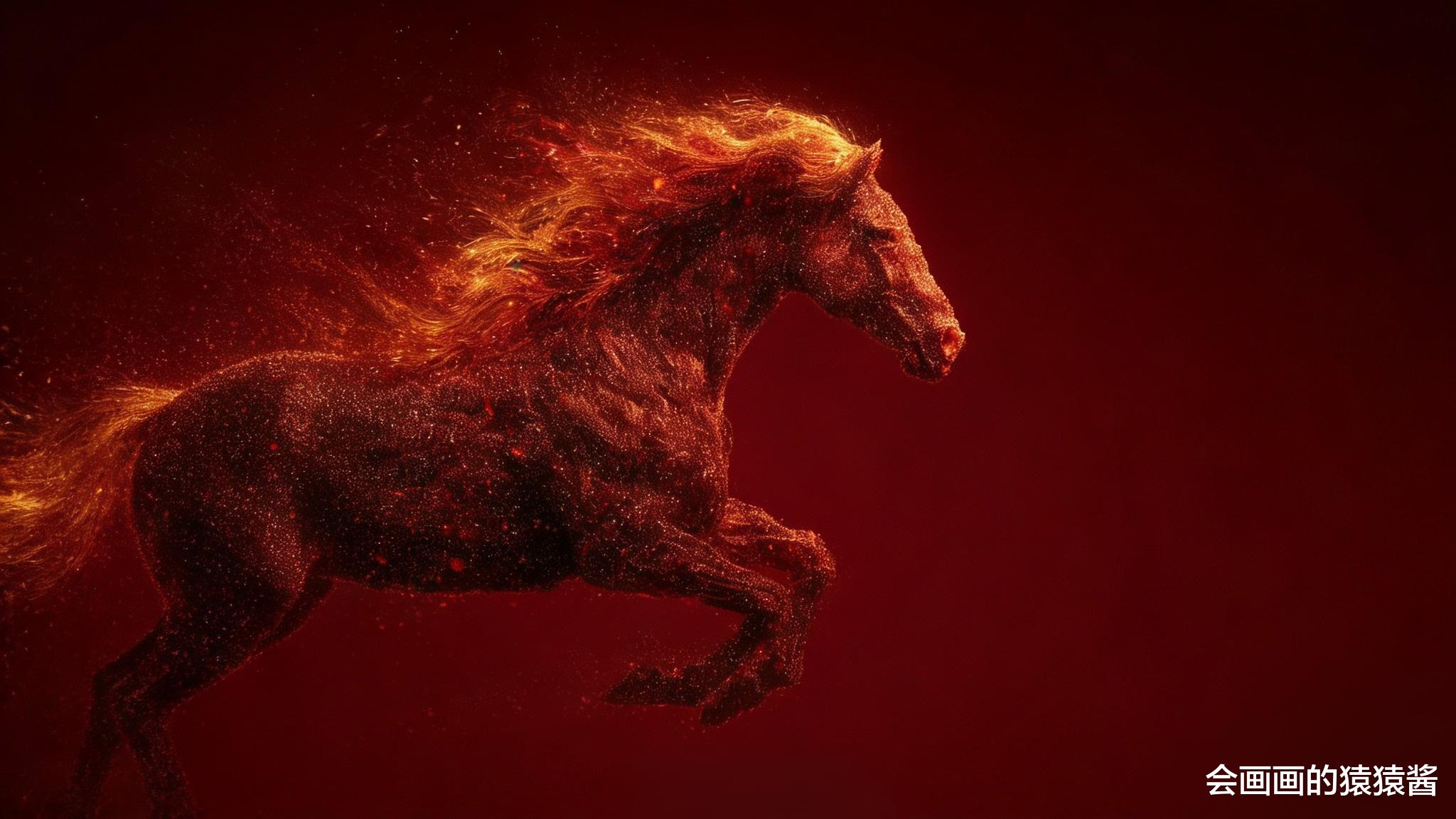 用 ComfyUI 生成赤马插画,精准还原了烈焰奔腾的磅礴气势与视觉张力。画面中的骏马通体由流动的火焰与星尘构成,鬃毛如烈焰翻涌,蹄间迸溅着火星,在深红背景的衬托下,仿佛从神话中踏火而来。