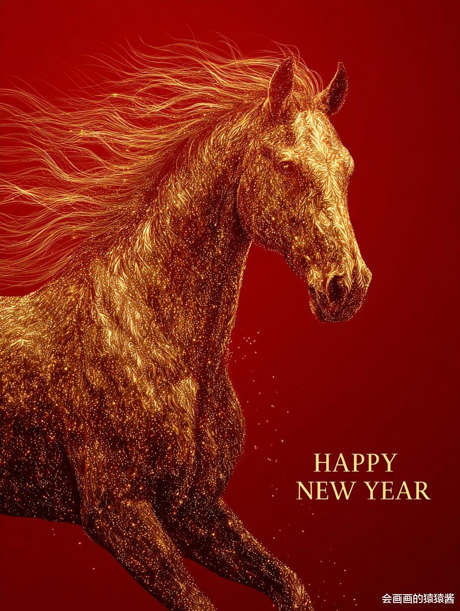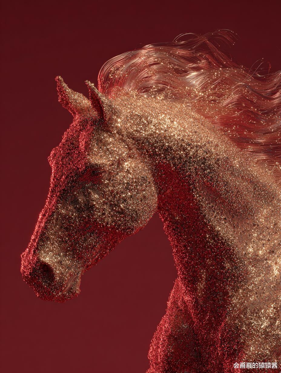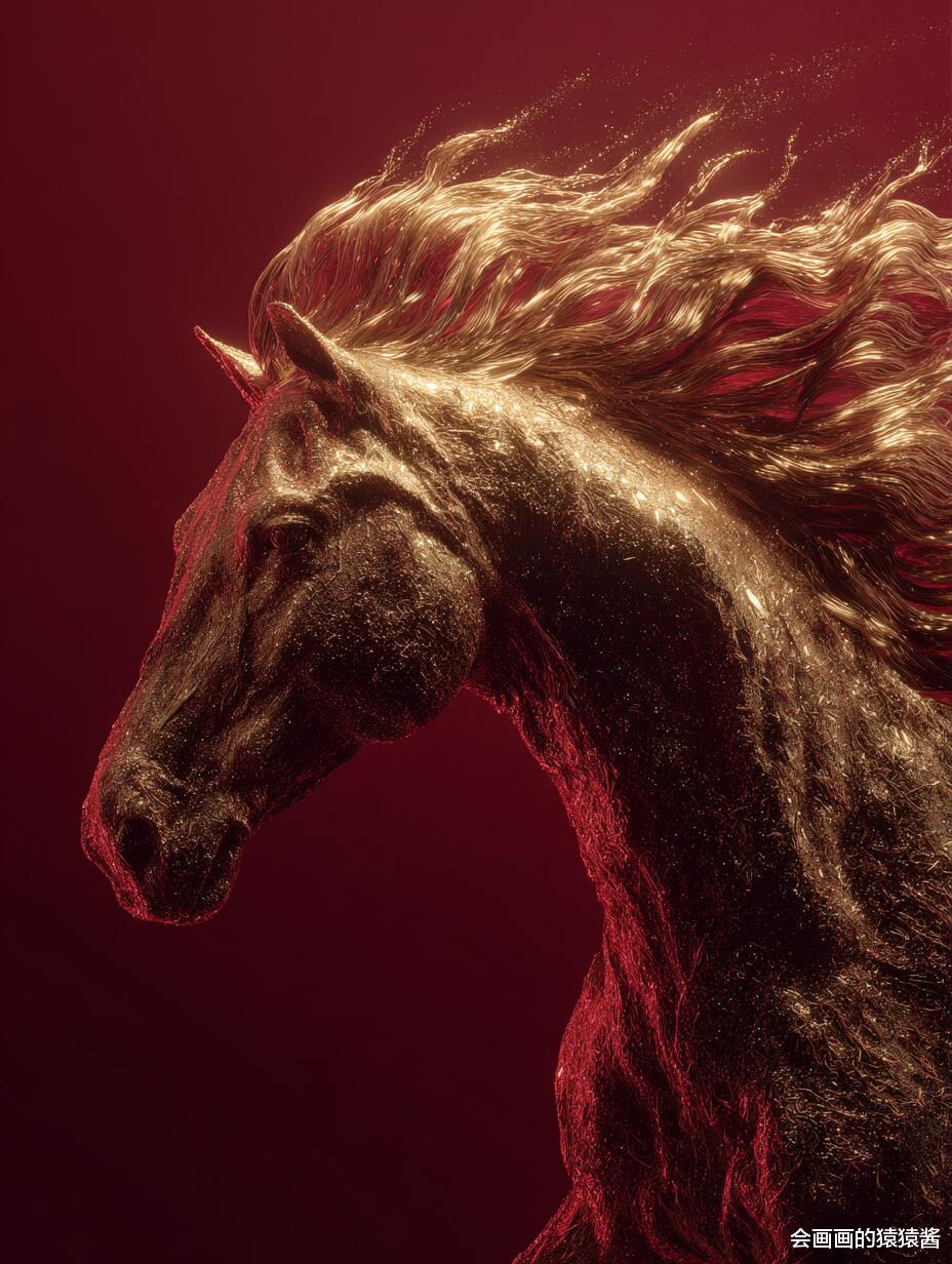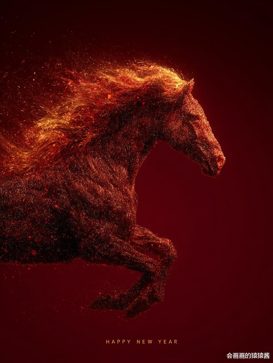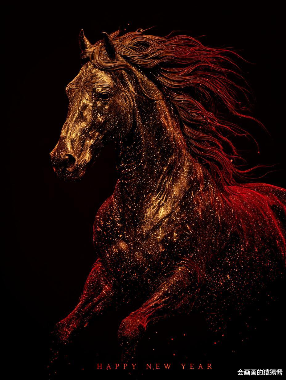 用 ComfyUI 生成赤马插画,精准还原了烈焰奔腾的磅礴气势与视觉张力。画面中的骏马通体由流动的火焰与星尘构成,鬃毛如烈焰翻涌,蹄间迸溅着火星,在深红背景的衬托下,仿佛从神话中踏火而来。