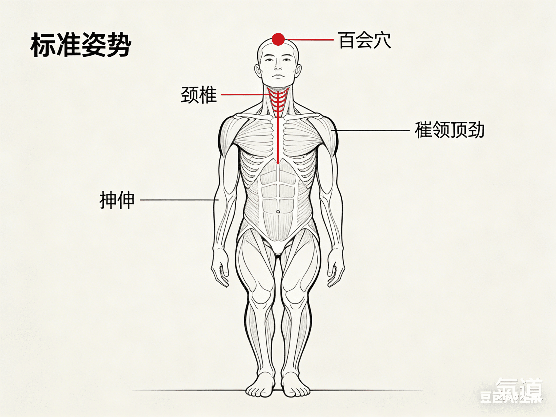 核心是“神贯于顶”,而非刻意用意引领百会穴——可想象头顶正中心百会穴有一根细丝轻轻向上悬托(非用力提拉),把整个人微微拔长。切记不可用意刻意提顶,只需以神贯注头顶,保持眼神平直、精神内敛即可。