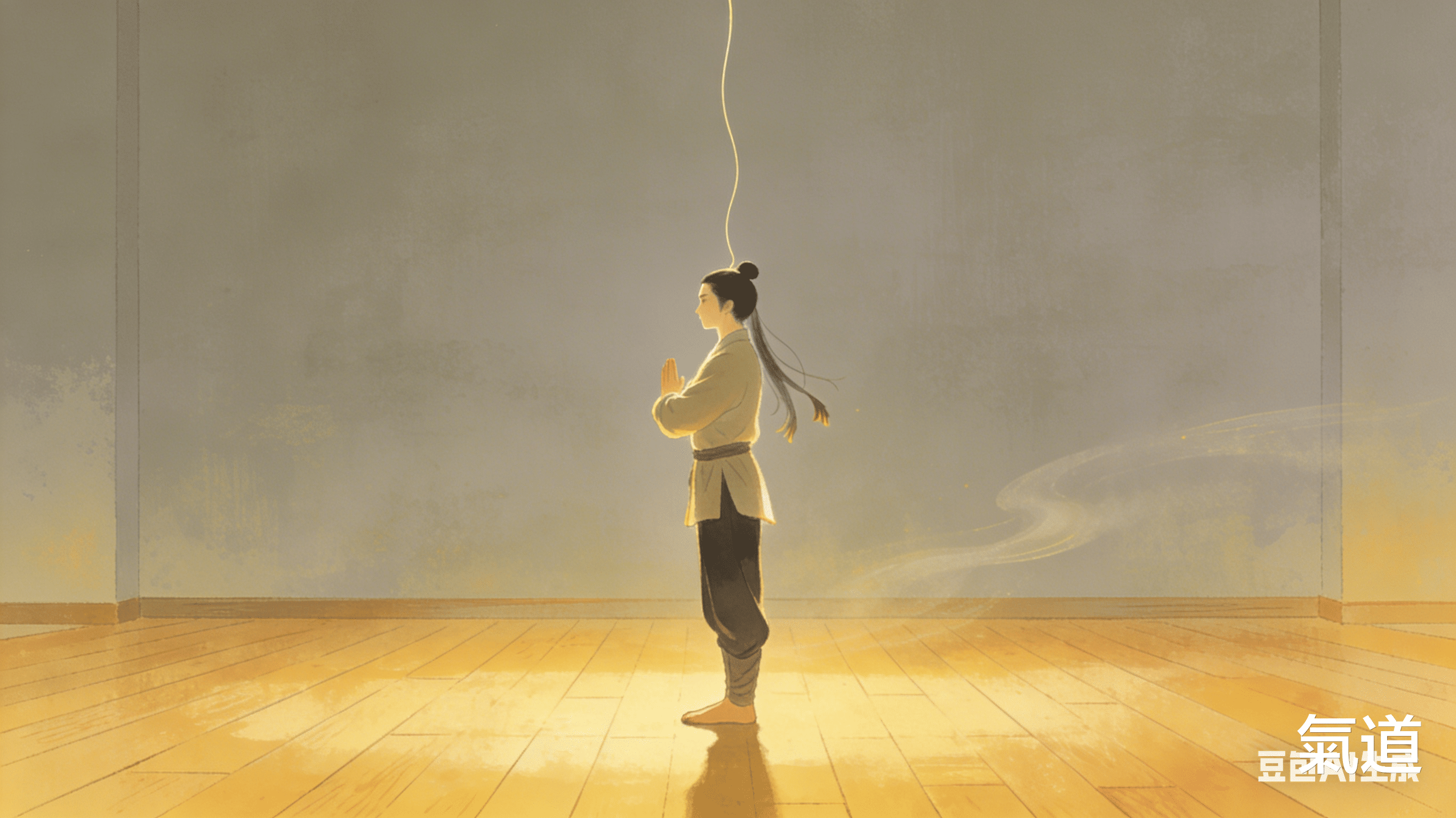 • 丝线轻轻向上悬托(非用力提拉),身体自然挺拔,核心是体会“神贯于顶、虚灵自然”的状态,而非刻意用意提顶