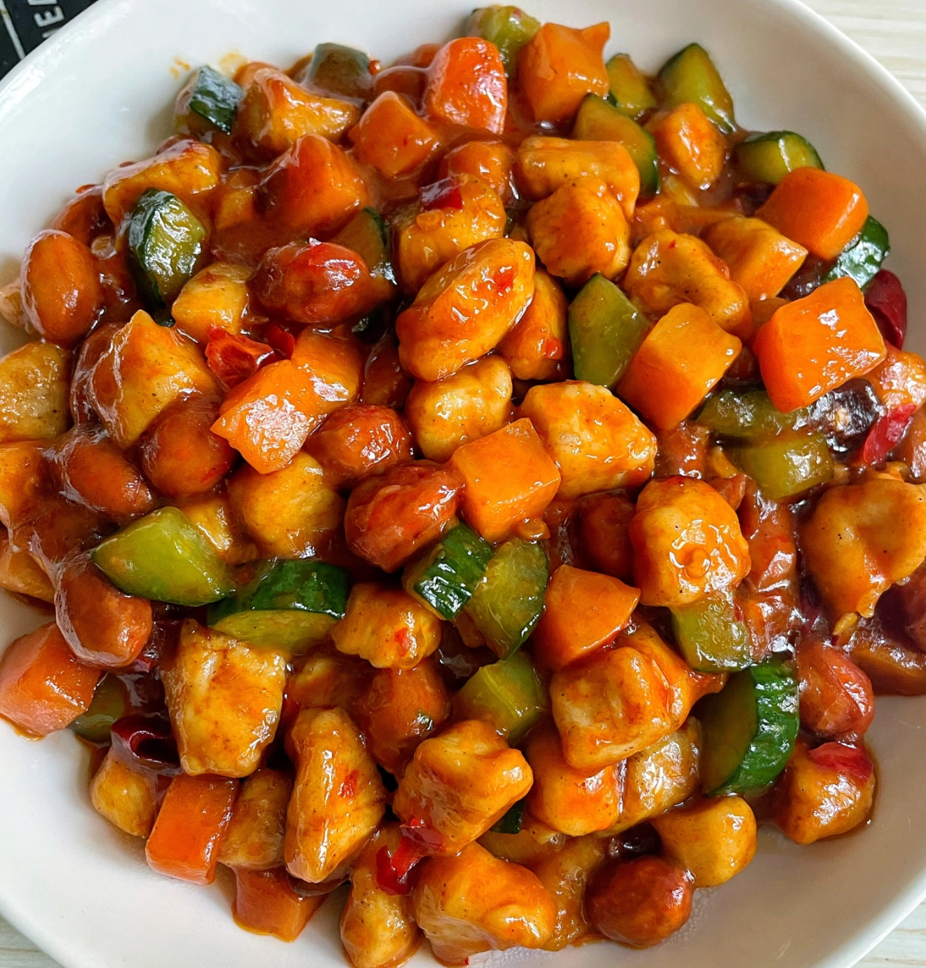 宫保鸡丁可是大有来头呢!它起源于清朝,相传是时任四川总督的丁宝桢发明的。丁宝桢对烹饪很有研究,他喜欢把鸡肉、花生米和辣椒一起炒着吃。后来他被封为“太子少保”,人们就把他发明的这道菜叫做“宫保鸡丁”。这道菜融合了川菜的麻辣鲜香,又带着独特的酸甜口感,一经推出就深受大家喜爱,还传遍了大江南北。