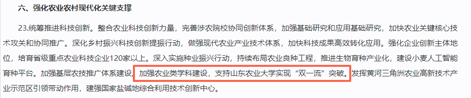 山东省属高校到现在都没有一所双一流,放在高考大省的环境里,其实还挺引人关注的,最近新出台的省一号文件里,清清楚楚写着支持山东农业大学实现双一流突破,注意, 不是鼓励争取,而是支持实现,单就措辞这一点不一样,懂行的人心里都清楚。