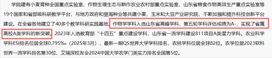 最有说服力的就是作物学,第五轮学科评估拿到了A-,把这个成绩放到整个山东省属高校里面来看,是A类学科零的突破,这是什么意思,山东很多省属高校里, 之前没有任何一所可以在学科评估里达到A类的门槛,山东农业大学是第一个,单单就凭这一点,在双一流评选里就已经有了一张入场券。