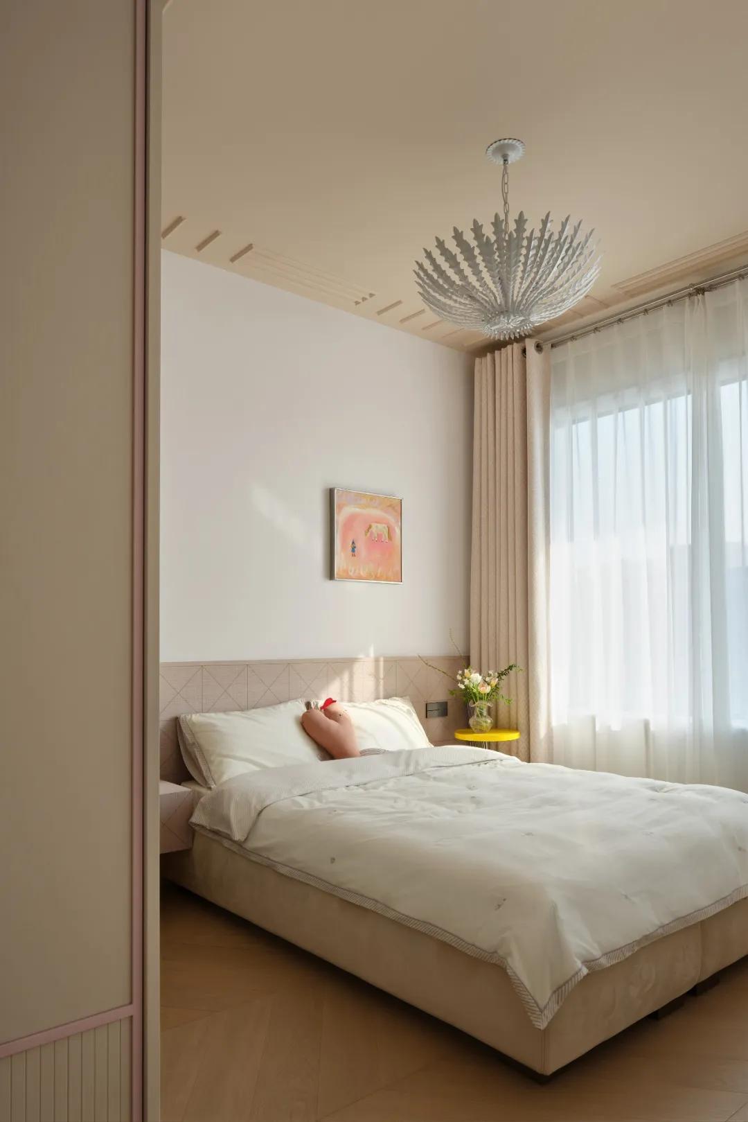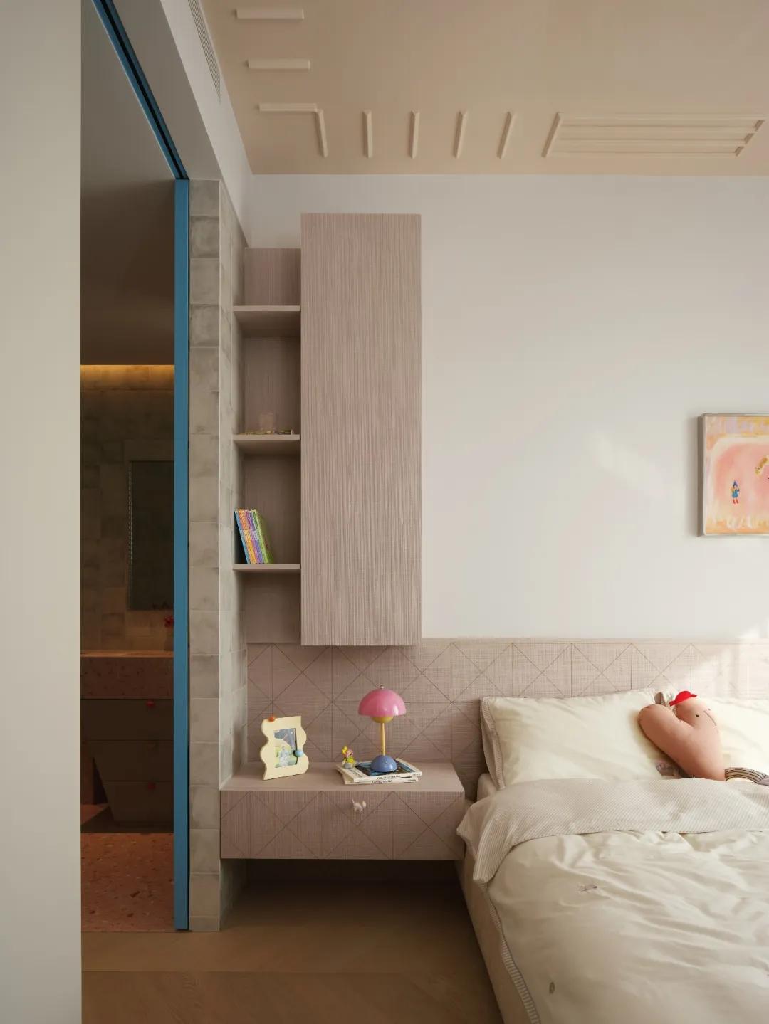 女儿房打造童年的粉色世界,低饱和色泽搭配柔软的面料、层次感线条,退让不必要的装饰,任由时间、空气与光一同生长,营造安全舒适的居家体验。卫生间延续了柔粉基调,以此划分区块的秩序感,细节之中亦能关照一份童趣。
