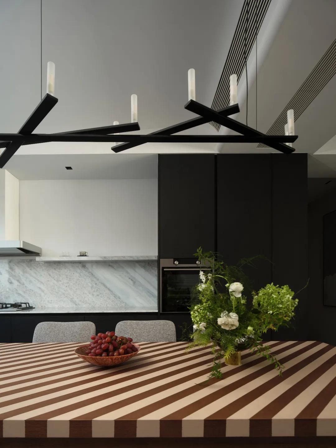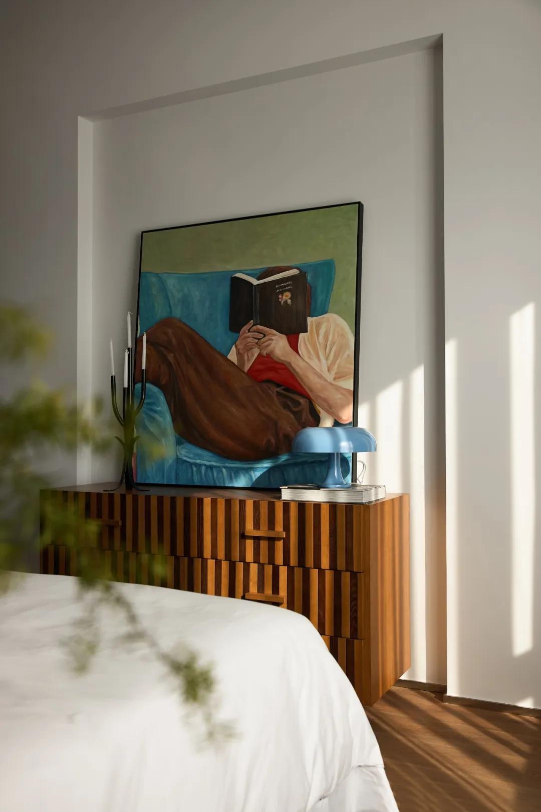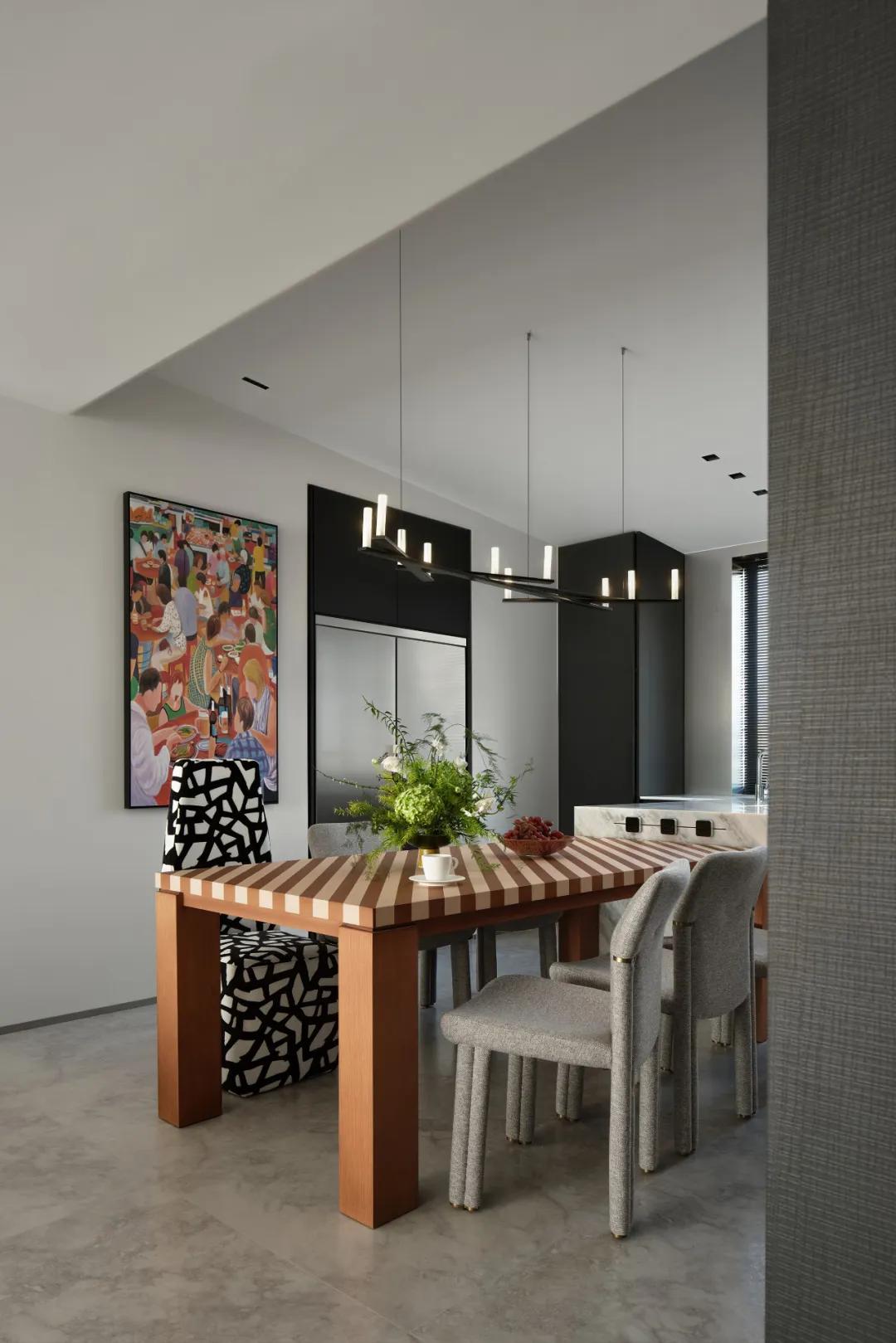 设计不止一味追求极简形式,结合人的动态轨迹、生活色彩与个性喜好,让空间成为内心的另一重映射。餐厅打破公共区的极简克制,选择纹理鲜明的餐桌,搭配当代艺术画,作为家的个性展示面,安置居住者专属的生活态度。