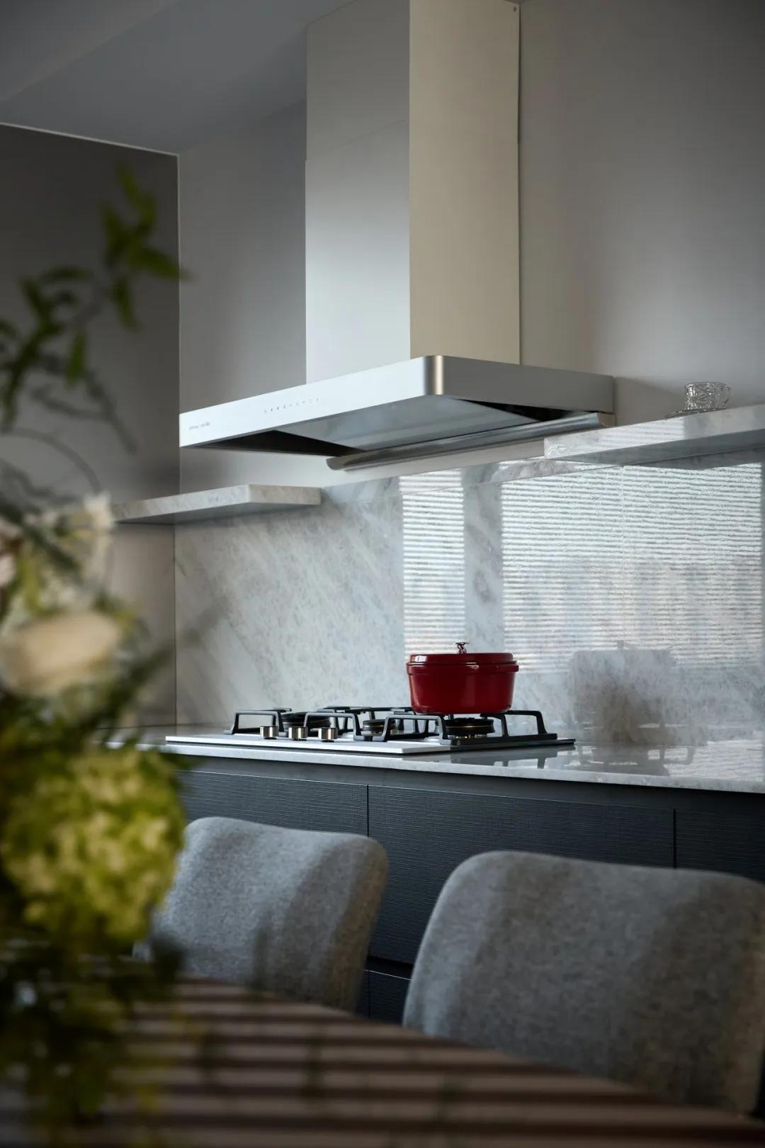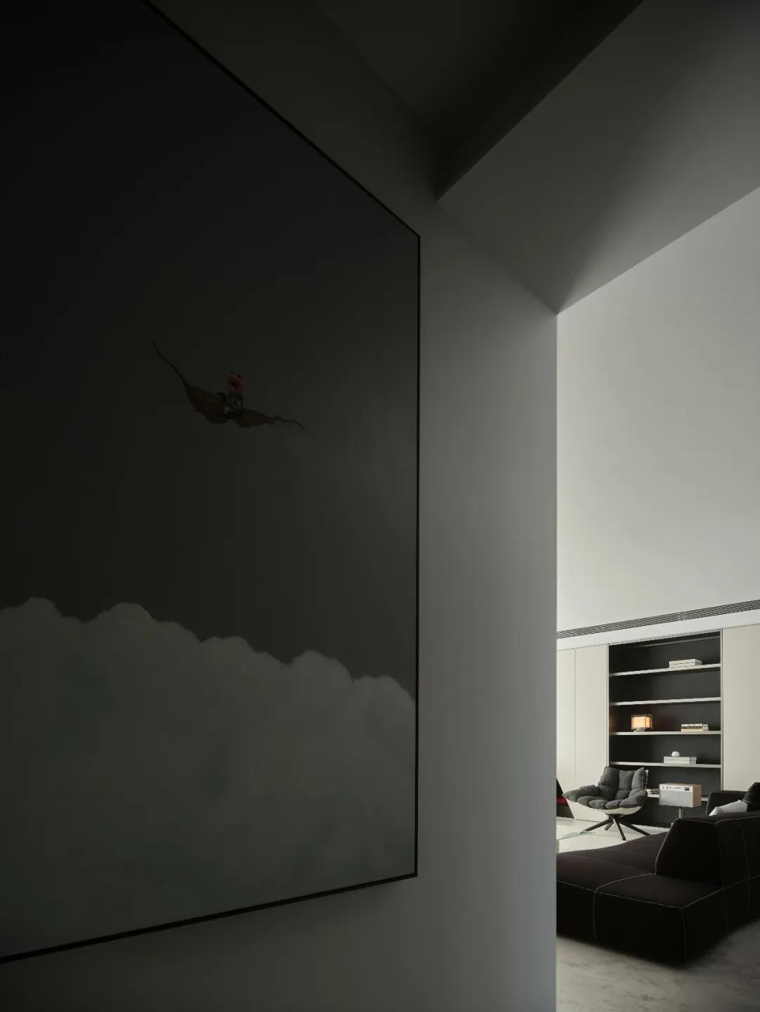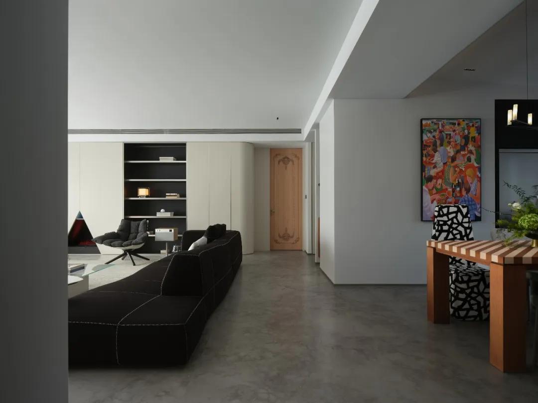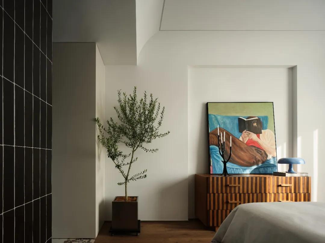设计不止一味追求极简形式,结合人的动态轨迹、生活色彩与个性喜好,让空间成为内心的另一重映射。餐厅打破公共区的极简克制,选择纹理鲜明的餐桌,搭配当代艺术画,作为家的个性展示面,安置居住者专属的生活态度。