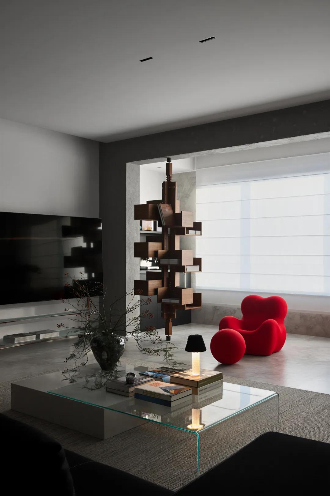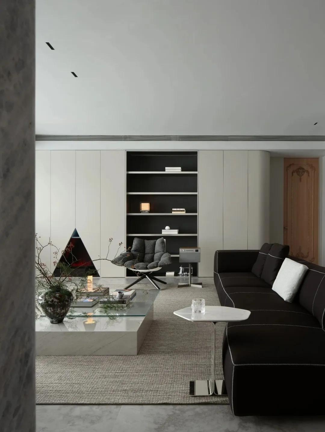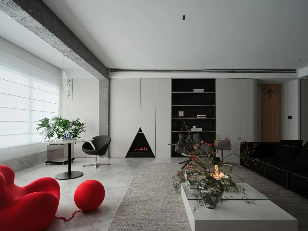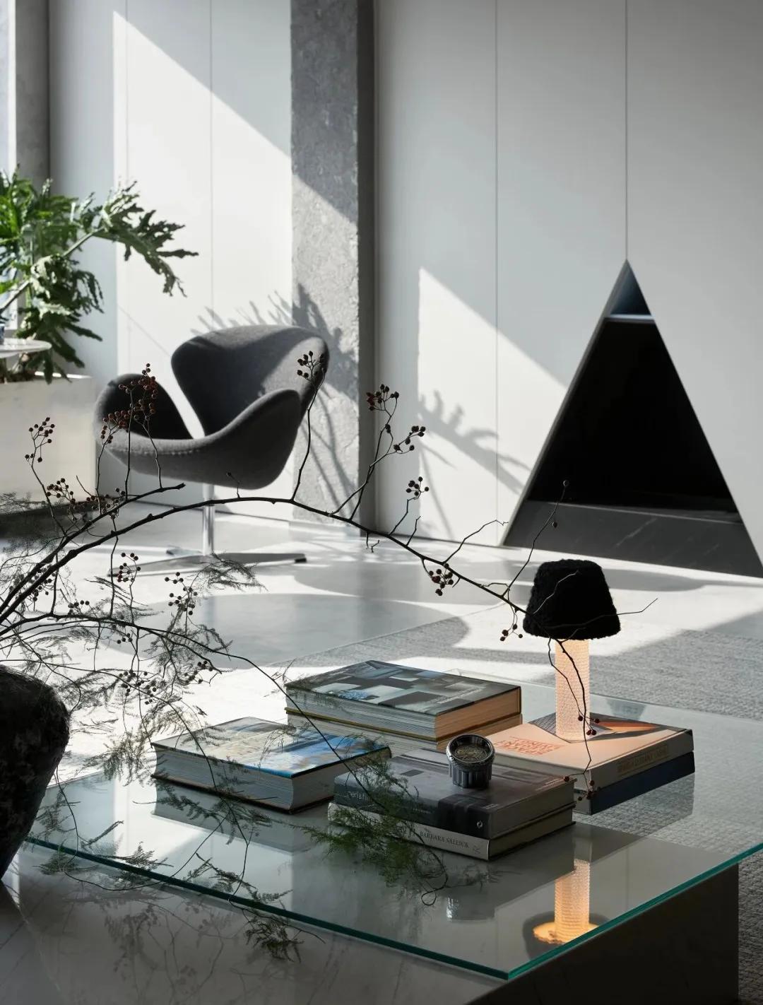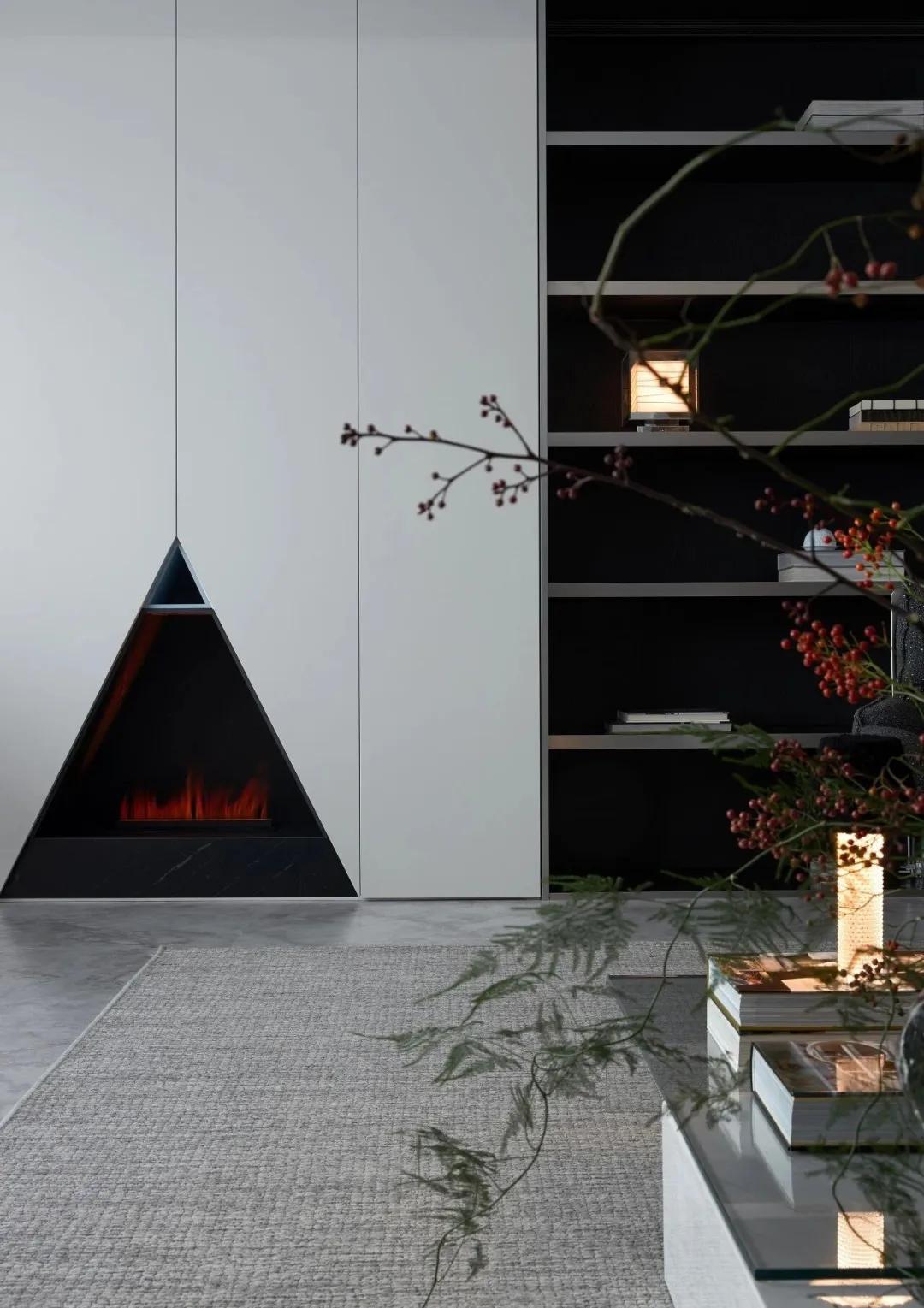 旋转书架、小圆桌把控着灵活尺度,可随意动态组合,增强空间的社交属性。三角壁炉打破单调平面,将先锋艺术的极简几何与自然温度共生,制造富有节奏感的空间体验。