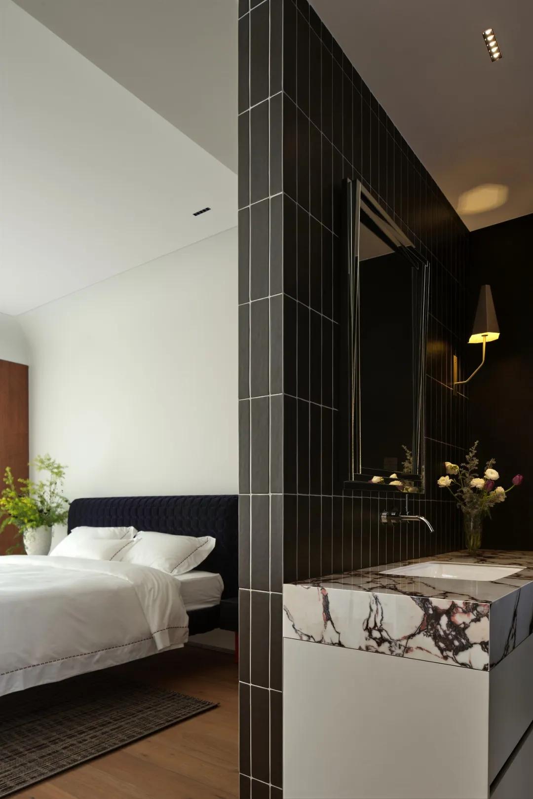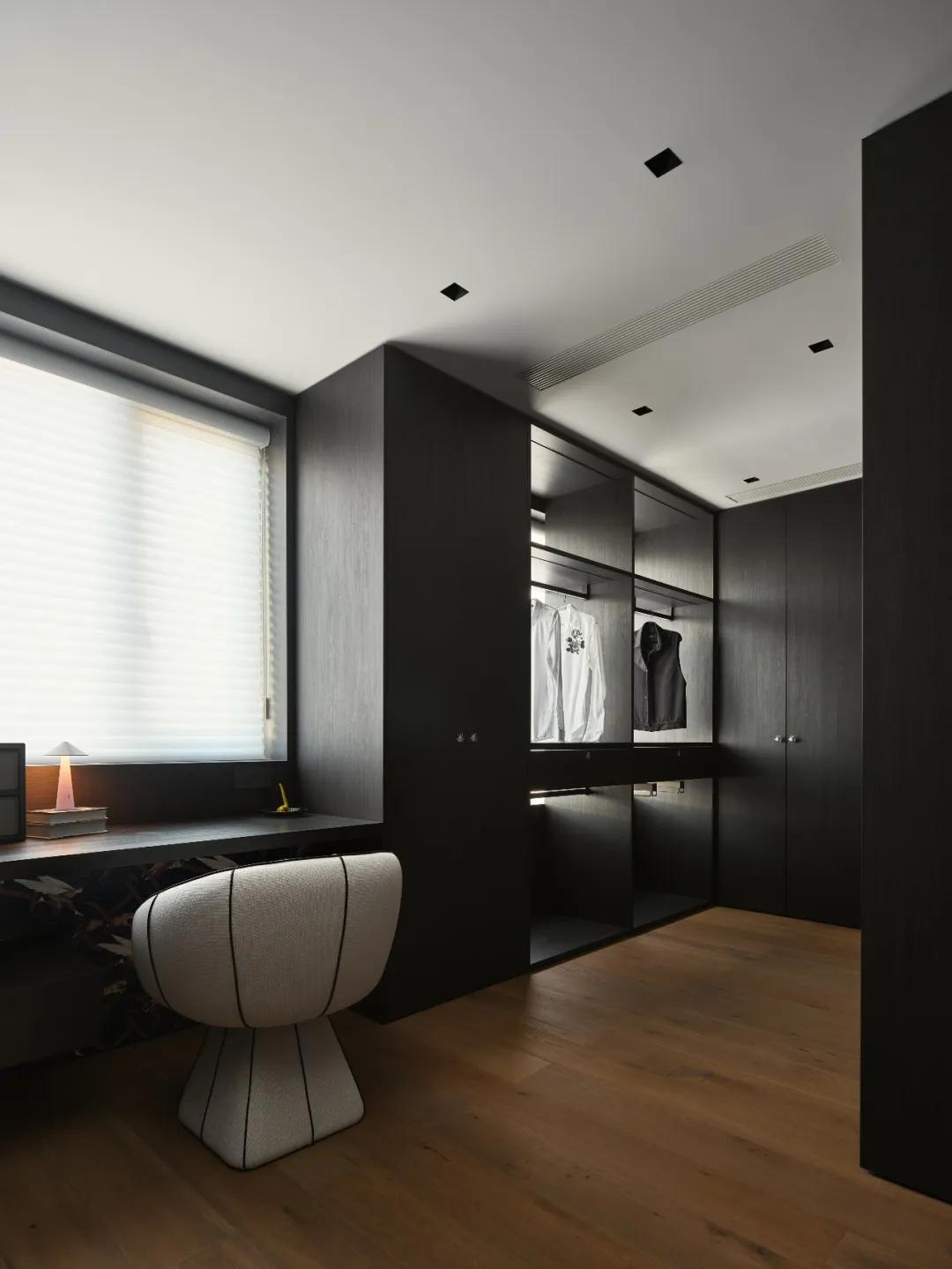 从以人为本的居住需求与生活品质的高阶追求出发,设计重塑套房布局,将北面房间并入主卧作为独立衣帽间,洗漱区通过动线分割形成流畅的三分离结构,合理调度洗漱、收纳、入寝秩序。衣帽间引光柔和一份雅黑的静谧,铺展非凡的仪式感,填补更丰满的内在叙事。
