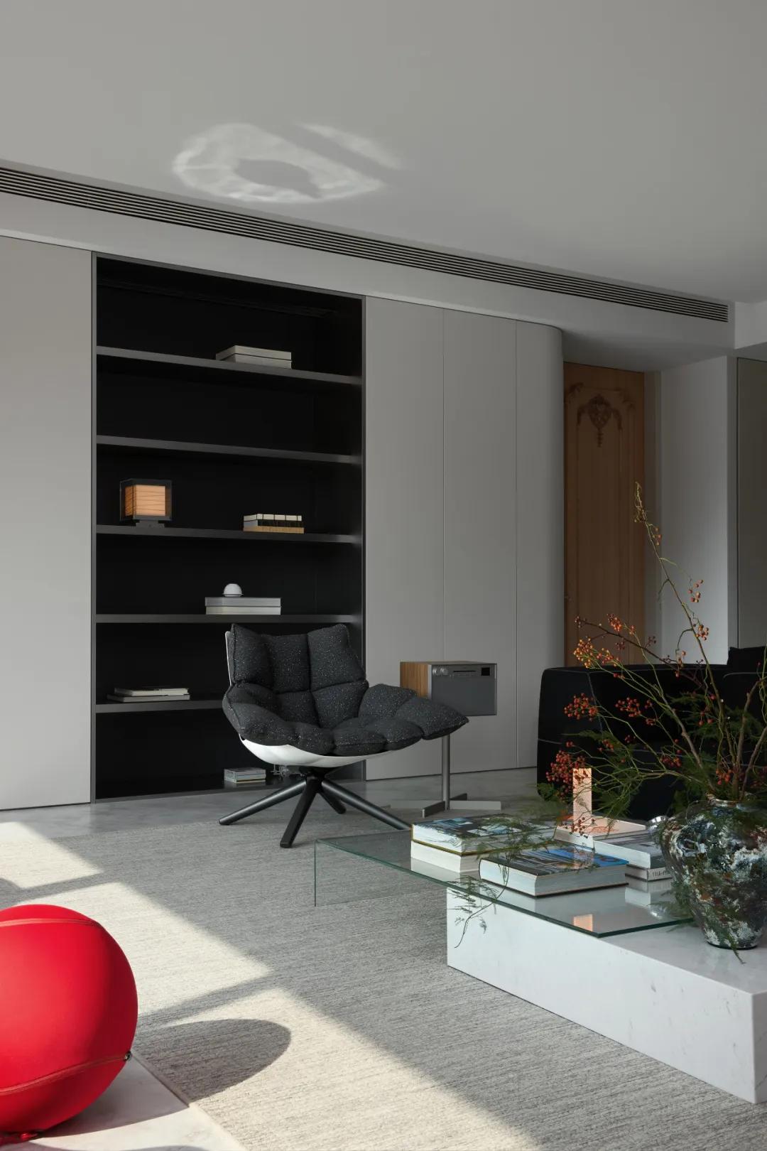 不锈钢柜体借线条的明晰感,延展流畅切面,外显器物陈列,内隐生活痕迹,皆能收放自如。B&B红色单人沙发与黑色模块式沙发互为联动,赋能意式的时尚创意。