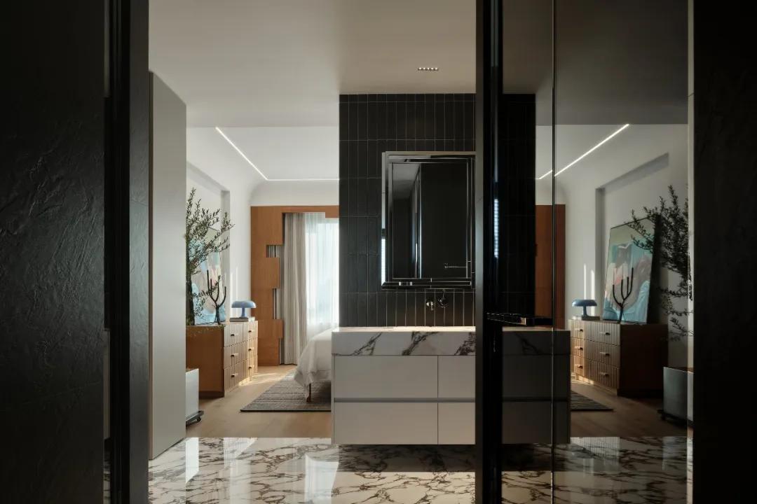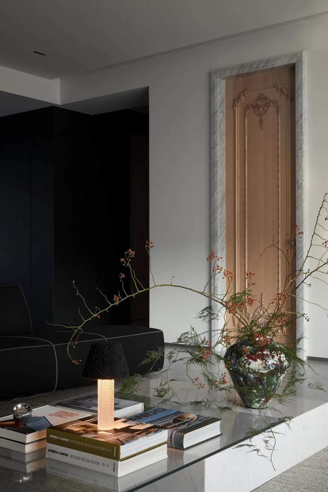 在当代美学的索引之下,打破形、色、质的传统预设。极简框架中内嵌温厚的木门,表层雕刻法式纹理,外层围合蓝水晶大理石门框,简约内敛亦能自持一份温柔,进一步感受设计的初衷与本能。