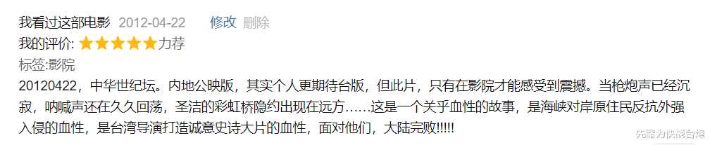 “当枪炮声已经沉寂,呐喊声还在久久回荡,圣洁的彩虹桥隐约出现在远方……这是一个关乎血性的故事,是海峡对岸原住民反抗外强入侵的血性,是台湾导演打造诚意史诗大片的血性……”