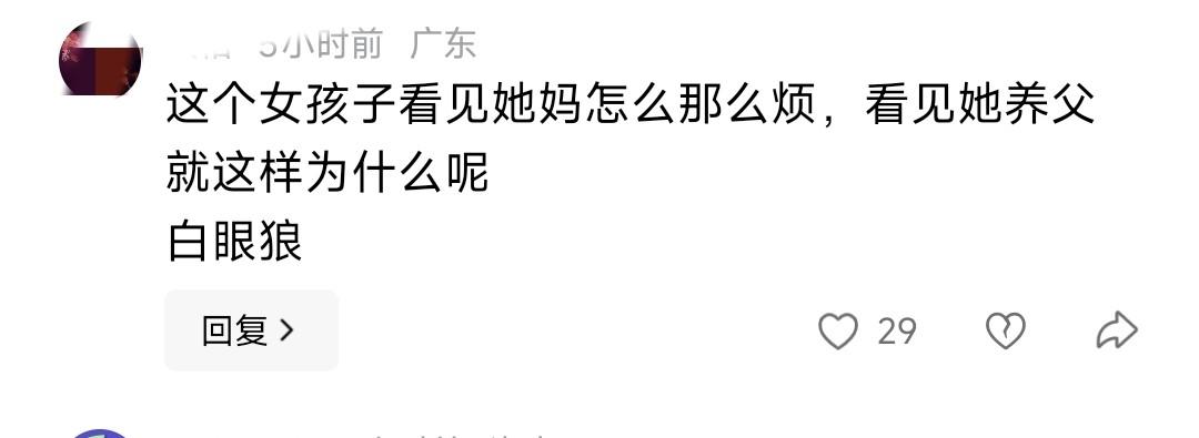 也有网友说,这个女孩子看见她妈怎么那么烦,看见她养父就这样为什么呢,白眼狼。我觉得这么说太片面了,背后的原因可能很复杂,不能光给人贴标签。