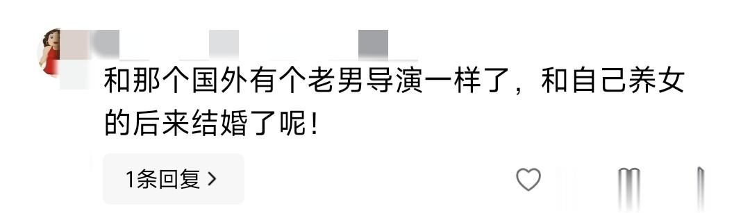有网友说,和那个国外有个老男导演一样了,和自己养女后来结婚了呢!我觉得这比喻确实扎心,把那种违背伦理的关系直接点透了。
