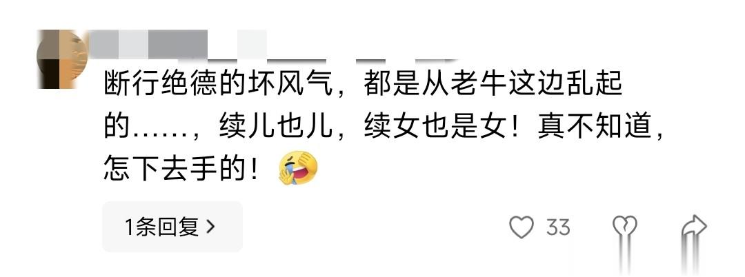 还有网友说,断行绝德的坏风气,都是从老牛这边乱起的……续儿也儿,续女也是女!真不知道,怎下去手的!我觉得这话骂得够狠,把这种行为的道德败坏说得明明白白。