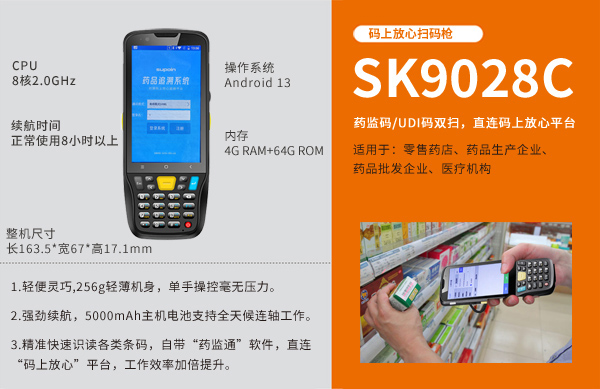 企业需配备支持扫描二维码的设备(如销邦SK9028C智能PDA)并安装平台认证的追溯软件,如“药监通”“追溯通”或对接自有ERP/WMS系统。确保设备具备4G或Wi-Fi联网功能,以便实时上传数据。