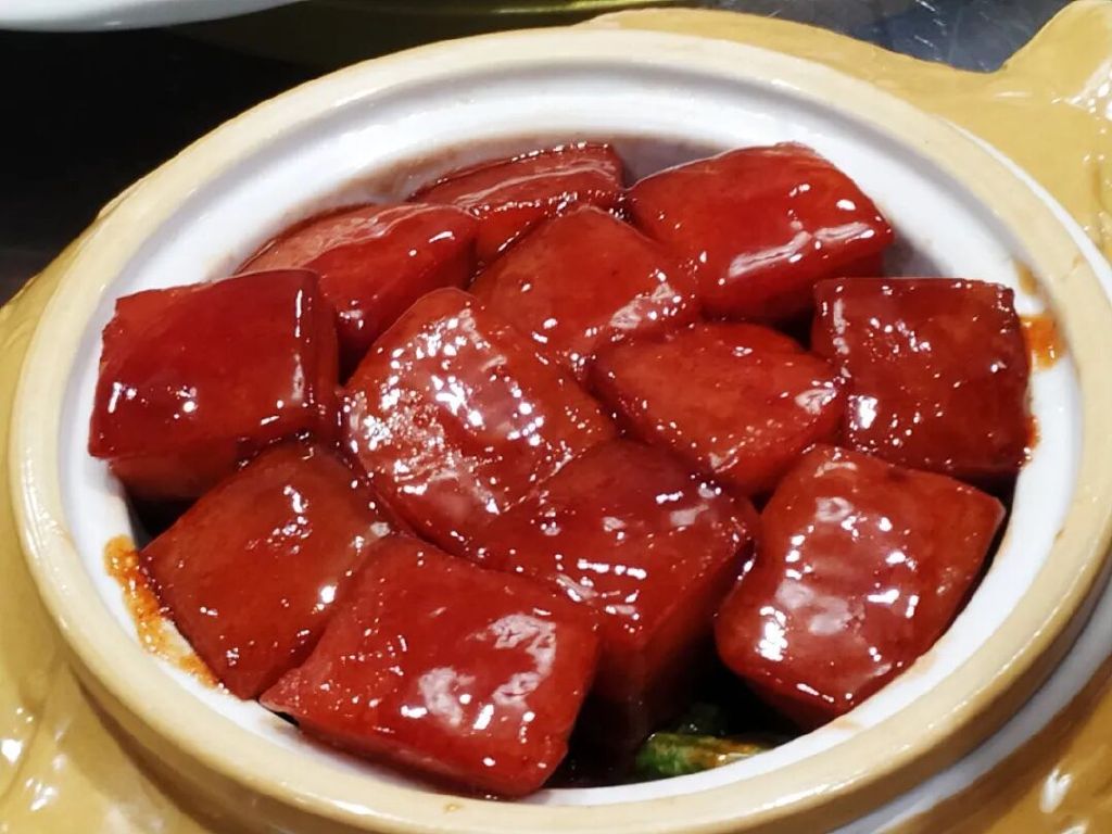 这道菜在曲园酒楼选用层次分明,肥瘦均匀的五花三层部位。