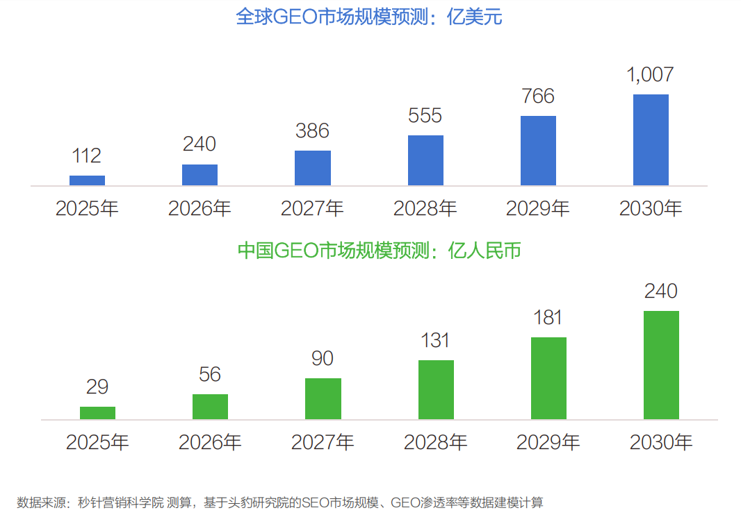 不同来源的数据都证明,SEO向GEO的转移是不可逆的趋势,未来几年中的GEO市场具