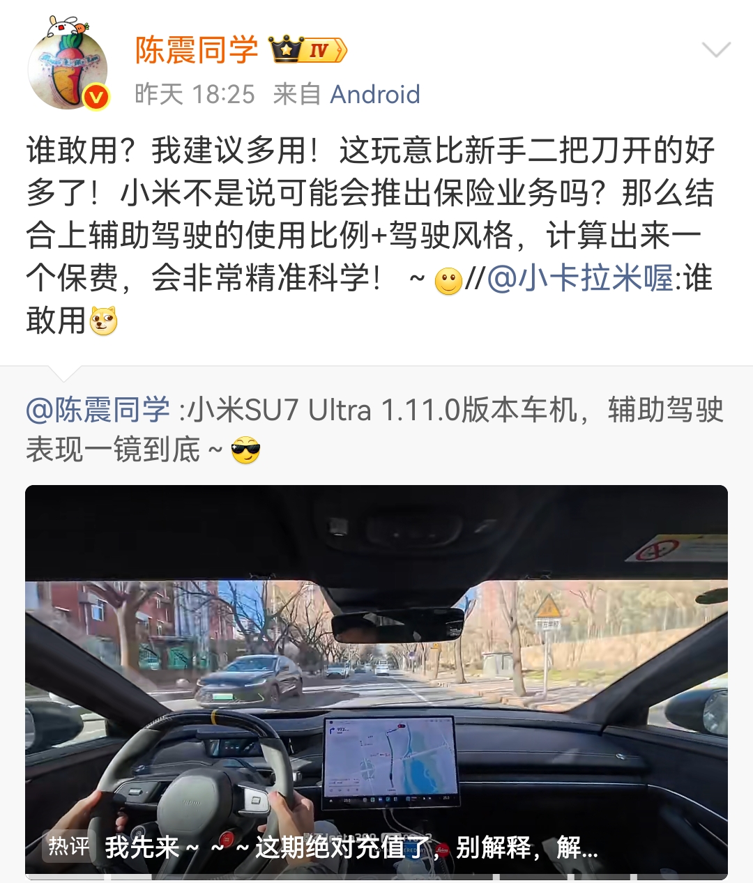 陈震同学是网络的知名汽车大V,他的一言一行都可能上热搜,特别是他最近盯上了雷军和小米这一块流量金字招牌,经常发这两个内容的东西。