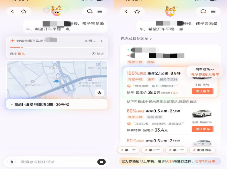 早上,北京的宝妈周琳(化名)要带孩子去儿研所复查。她打开滴滴,对着AI小滴说:“带孩子去医院,容易晕车,想要开得稳一点的车。”