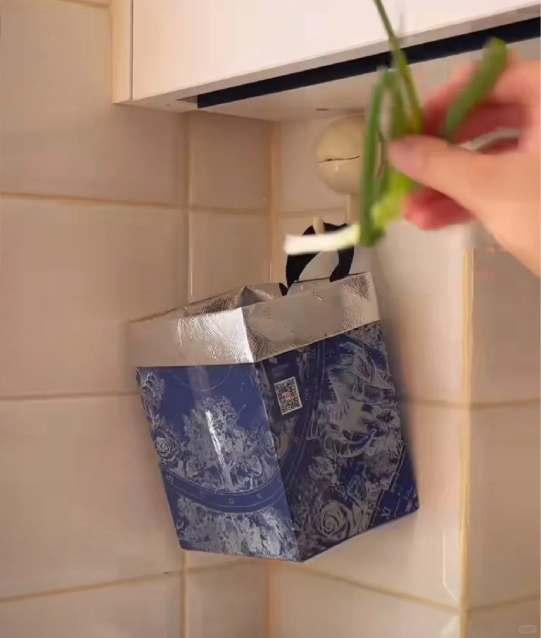 厨房的葱姜蒜总是没有地方收纳,不用花钱去买专门的收纳盒,其实用奶茶袋子就搞定了,将大小合适的奶茶袋子挂在厨房合适的位置上,葱姜蒜什么的都可以放在里面收纳。