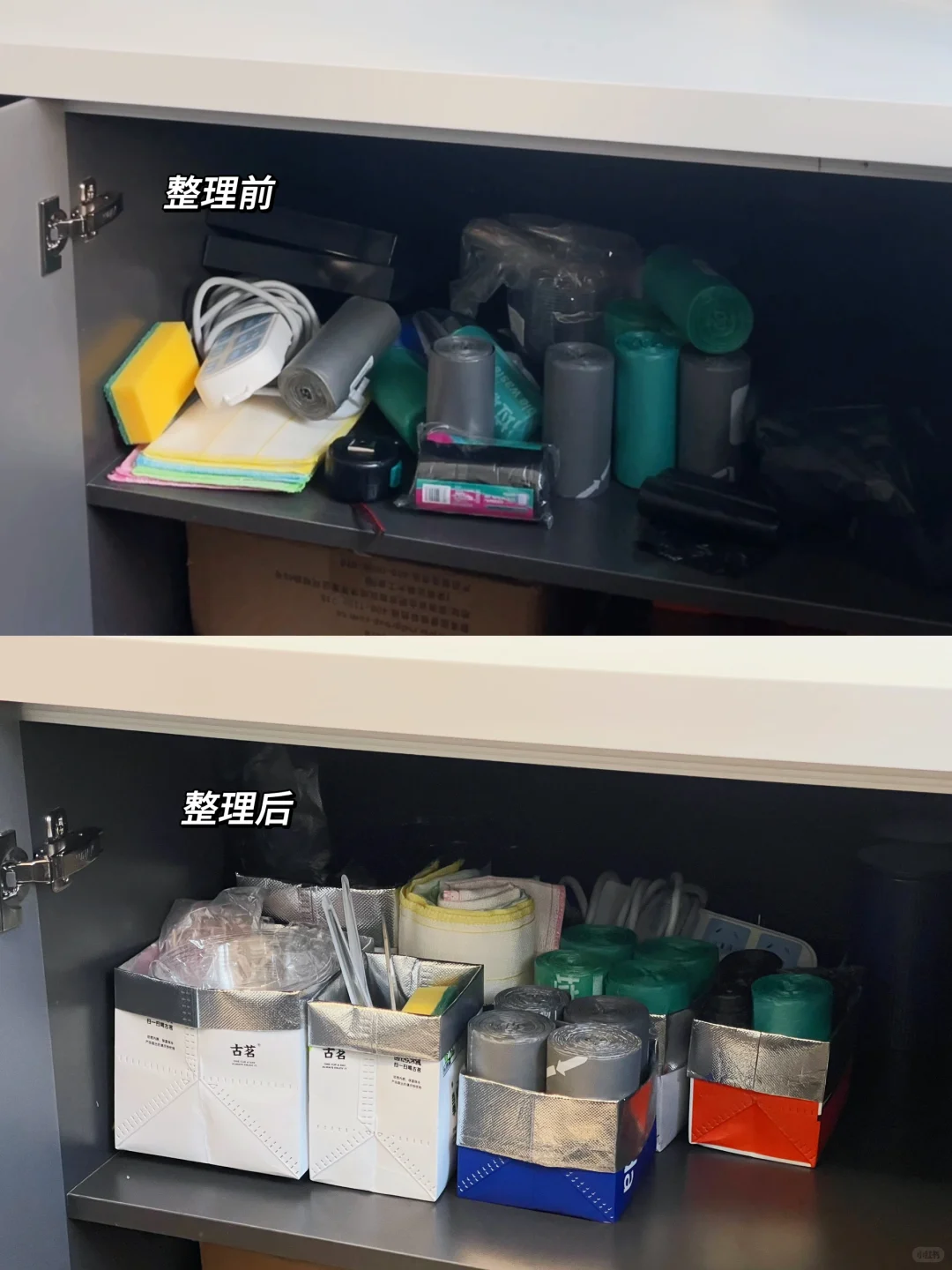 厨房里的东西比较多,要是不好好收纳,再大的柜子都不够用的,就像家里用的垃圾袋,随便放太占地方了,可以用奶茶袋子将这些垃圾袋等杂乱的东西收纳在一起。