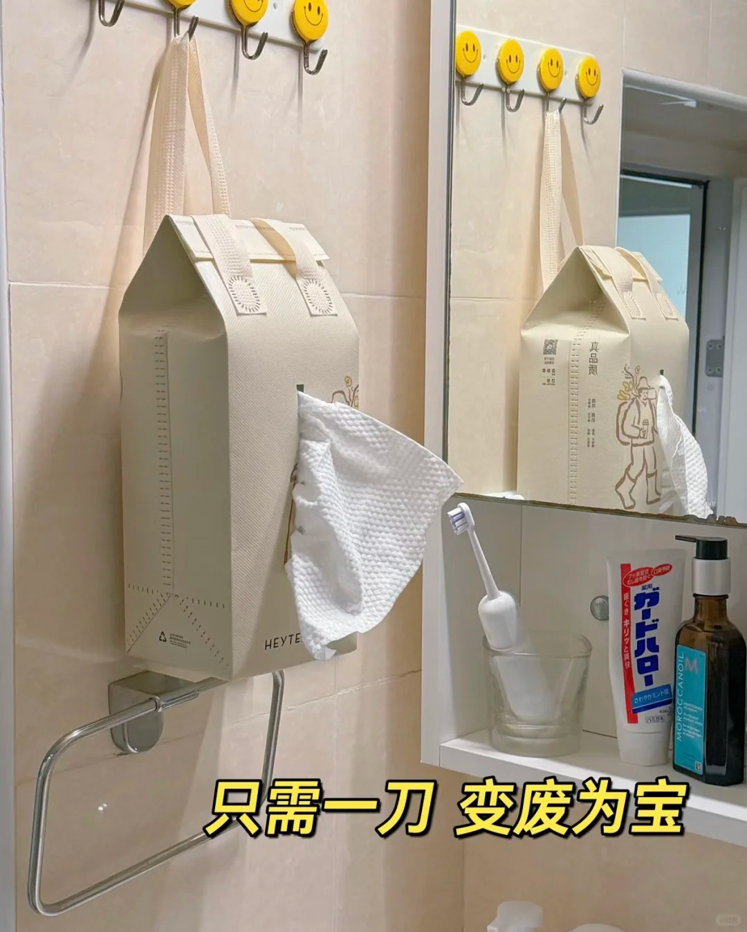 老妈用奶茶袋子就搞定了,奶茶袋子用剪刀剪开一个口,洗脸巾放在里面就可以了,然后挂在卫生间,这样用的时候顺手一抽就取出来的,太方便了。