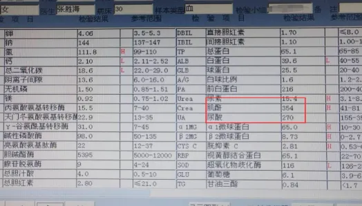 第一次肾功能检查,血肌酐已经升高到了354umol/L进入到了慢性肾衰竭阶段,血红蛋白74g/L下降显著,造血功能明显失衡。