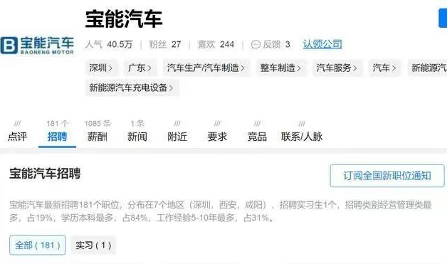 近期在多家的招聘网站上显示,宝能汽车在很多地方开始大规模的招聘员工。比如某个招聘平台显示,宝能汽车最新招聘181个职位,
