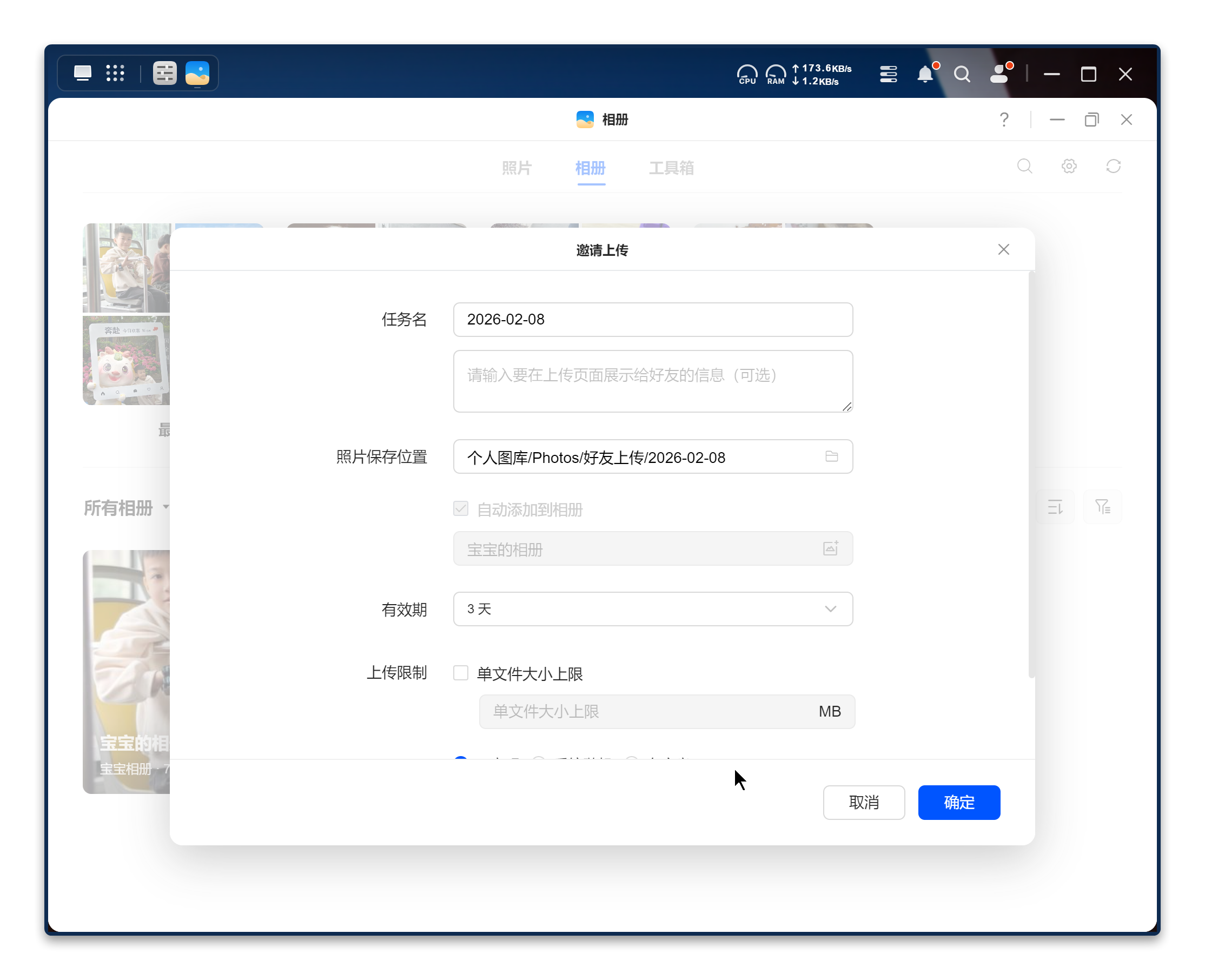 通过相册的邀请上传功能,可将相册上传功能共享,家庭成员一起补齐照片。