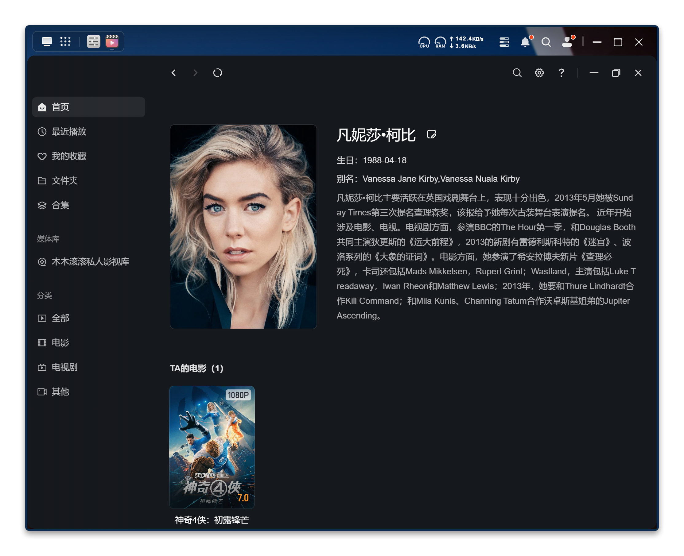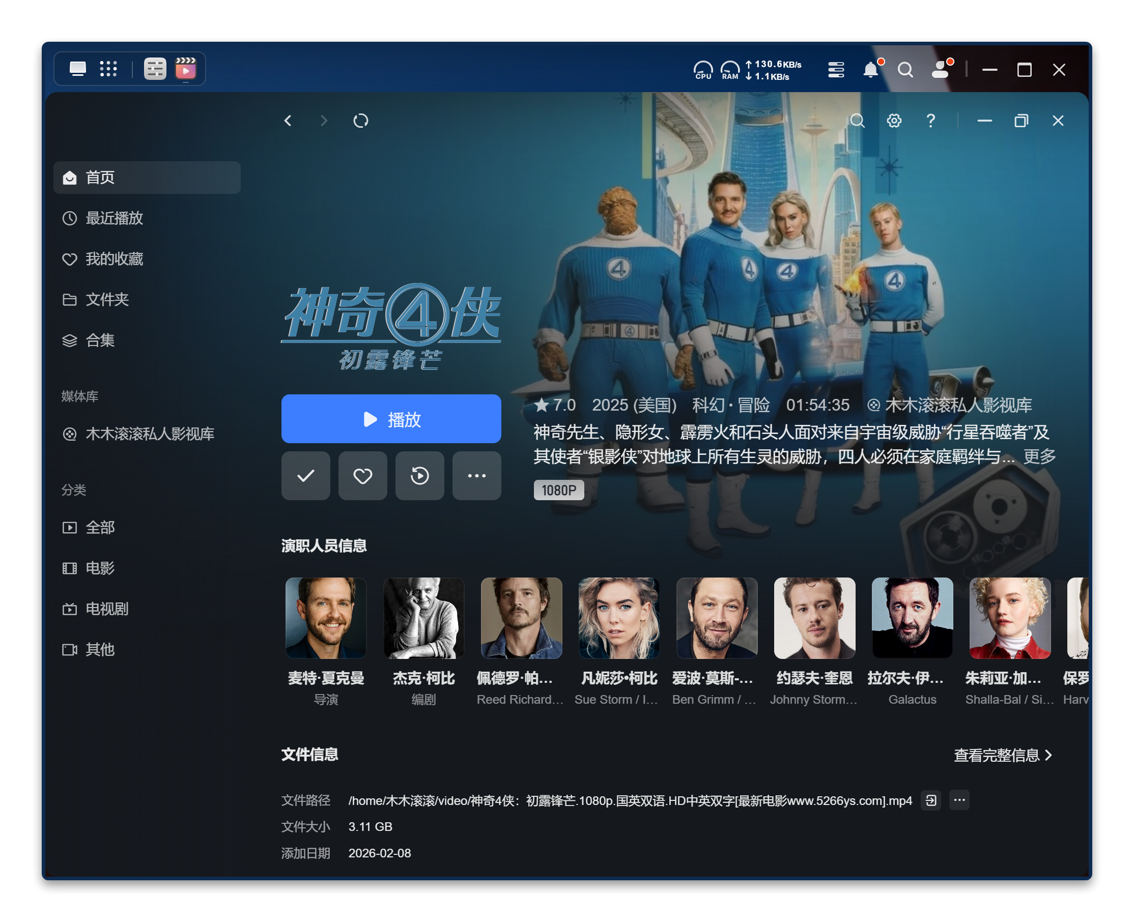 这得益于其融合了 TMDB 与智能识别双刮削源,实测识别非常精准且迅速,进入电影详情界面,能看到相关海报、主演,以及主演的信息,更加全面了解电影。以往要实现这样的功能,往往要自己搭建Jellyfin等应用,才能实现,复杂的部署过程,会劝退不少人,而绿联内置的影视中心轻松实现,大大降低了使用门槛。