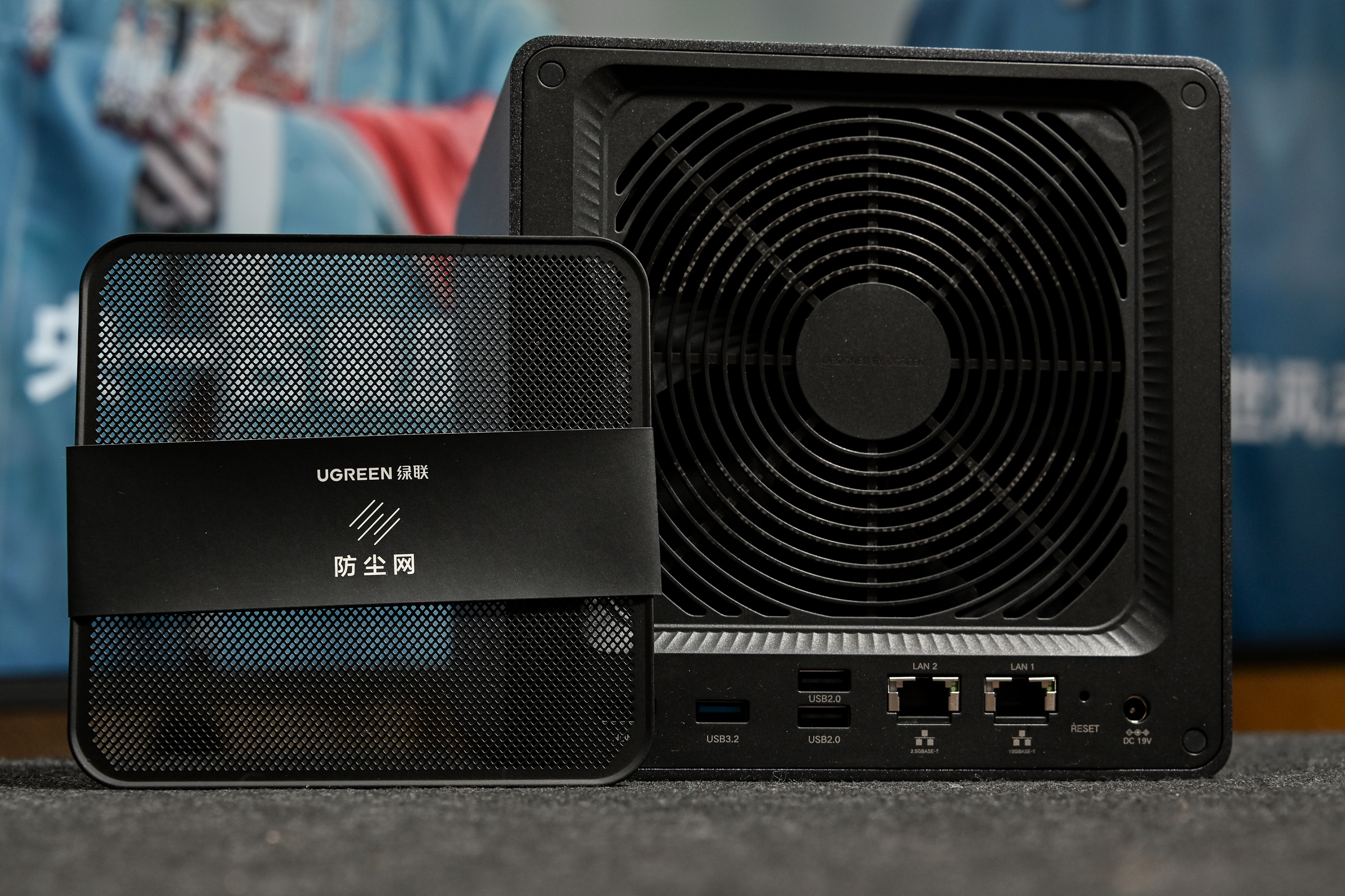 在nas背面,可以看到绿联为其设置了超大的磁吸式防尘网罩,要知道nas运行久了,散热口很容易积攒灰尘,进入机身内,这一小细节设计好评了。