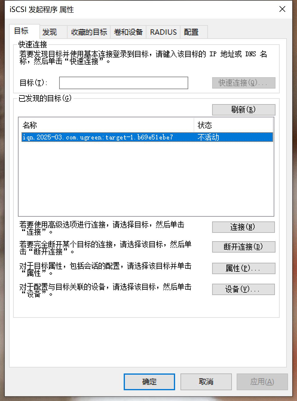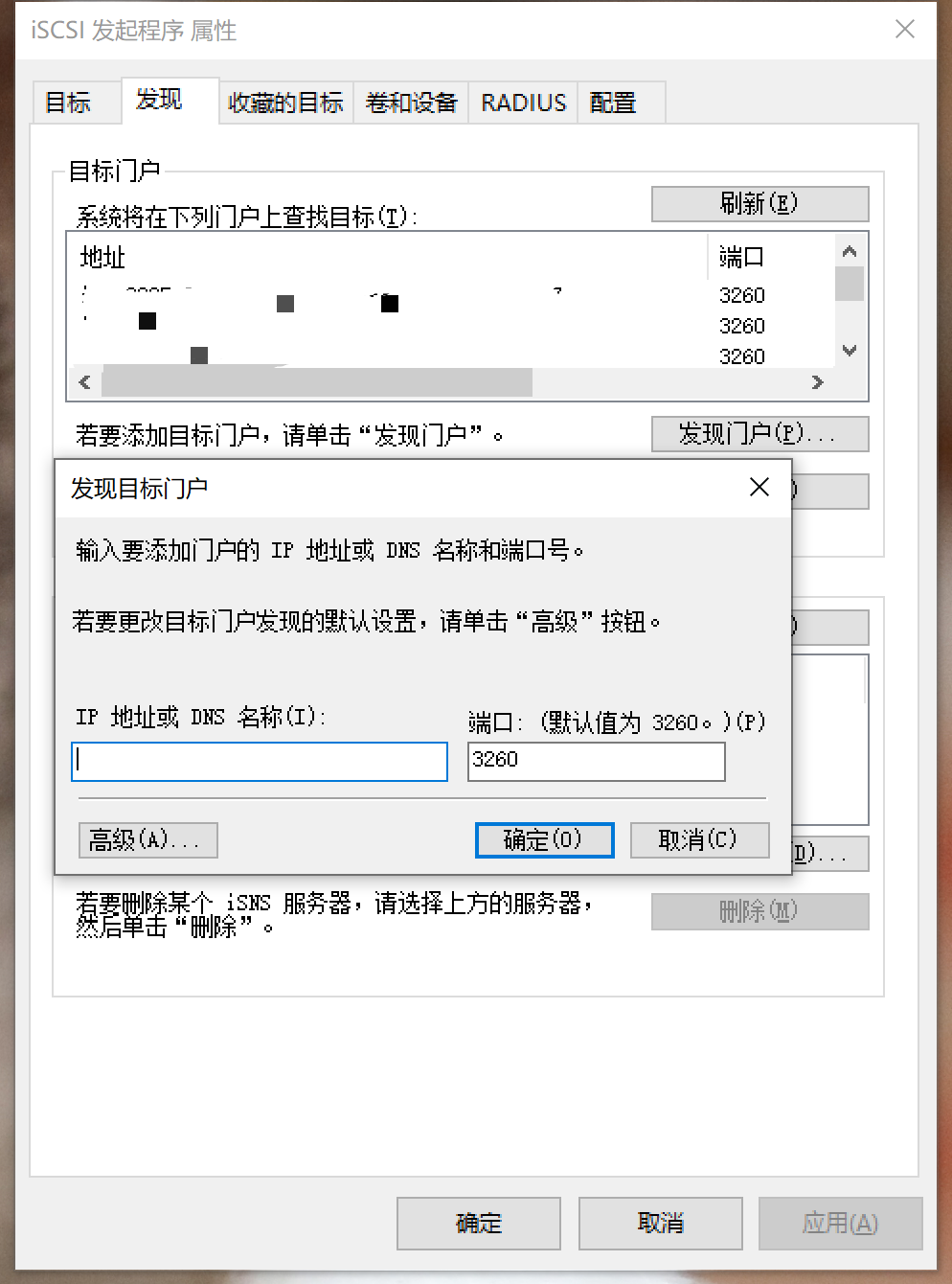 接下来在主机上进行配置,以Windows系统为例:按下Win+R键打开“运行”对话框,输入iscsicpl并回车,即可打开iSCSI发起程序设置界面。在“发现”选项卡中,点击“发现门户”,输入绿联NAS的IP地址(可在NAS的网络设置中查看),端口保持默认的3260即可。