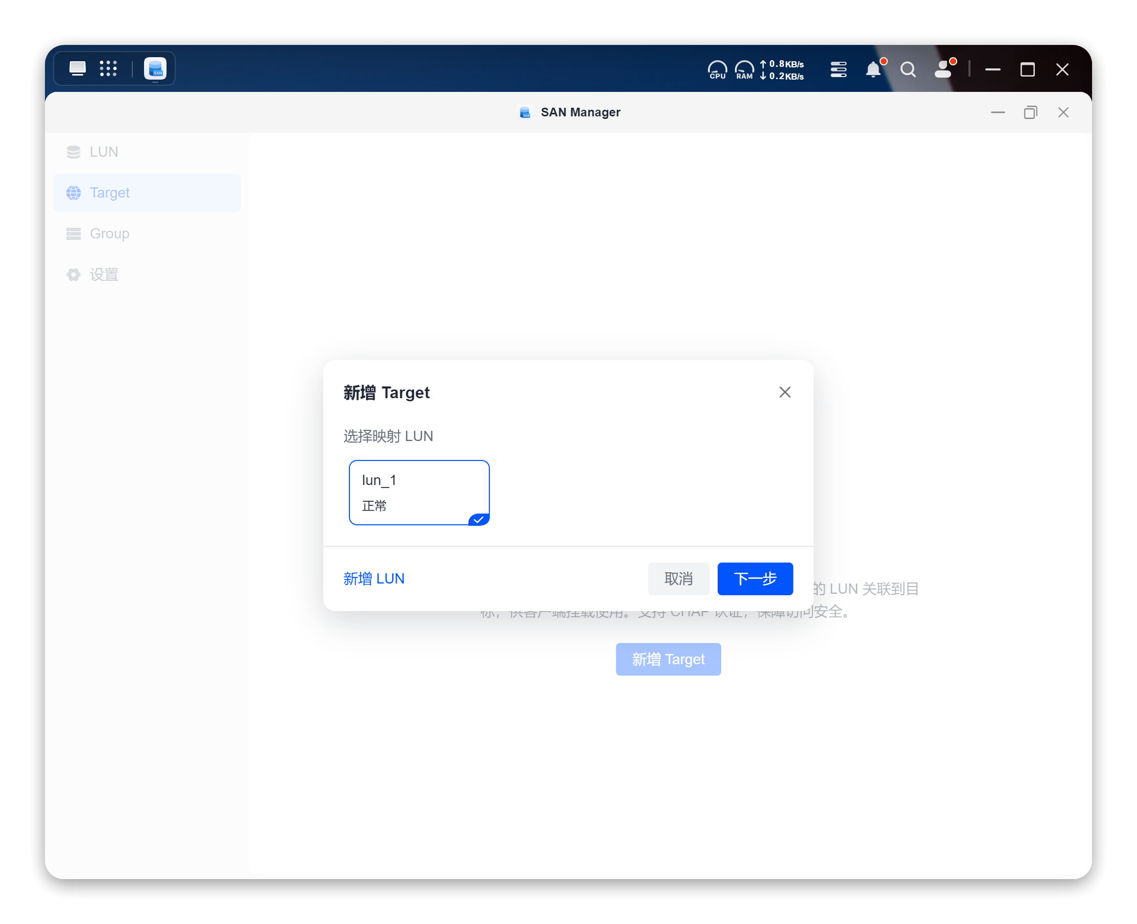当我们下载好应用后,直接创建一个LUN,分配好容量,以及选择其所属的存储空间位置,到了Target界面,选中刚才新增的映射LUN,即可完成创建。