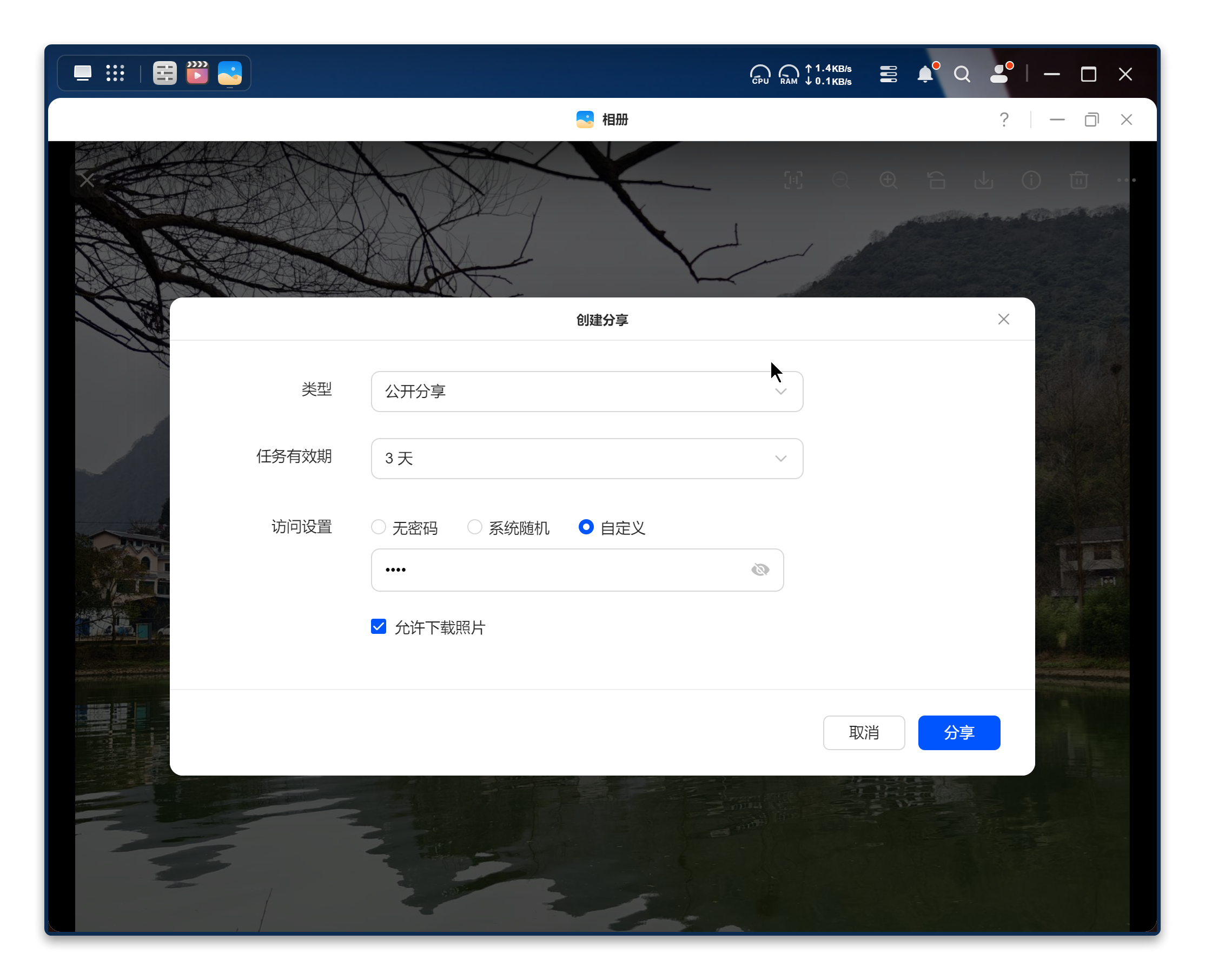 在相册内,也提供了分享功能,使用起来与网盘类似,可设置权限类型为公开分享,或是设备用户查看、分享的有效期、访问的密码、是否允许下载等,确保私密照片的安全。