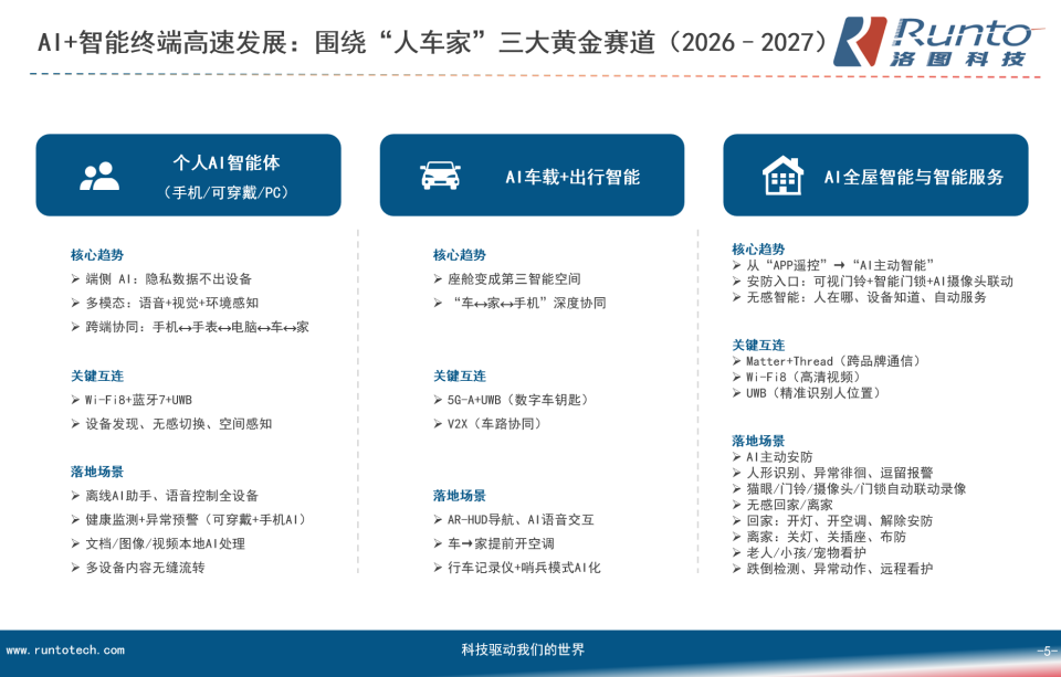 从2026年至2027年,AI+智能终端将围绕“人、车、家”三大黄金赛道实现高速发展。洛图科技(RUNTO)阐述了这三大场景的核心发展趋势、关键互联技术及落地应用场景。